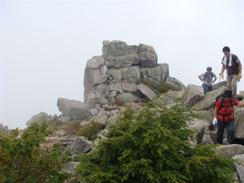 廻り目平でキャンプをし6:00から朝食準備をして8:30出発した。途中ロッククライミングの練習をしていたのを見物しながら約1時間くらいだらだらな林道を歩いていき登山口に到着。ここで昨晩の飲みすぎがたたり1名脱落してしまった。ここから4名で登山開始である。金峰山荘まで約2時間で到着し昼食をした。ここらあたりが森林限界でここから頂上までは岩とハイマツの中を20分歩き頂上に到着した。ガスが出始めていたが頂上ではさ~と雲が取れ日が差してきて眺めもまあまあであった。写真は2007/9/23金峰山頂にて