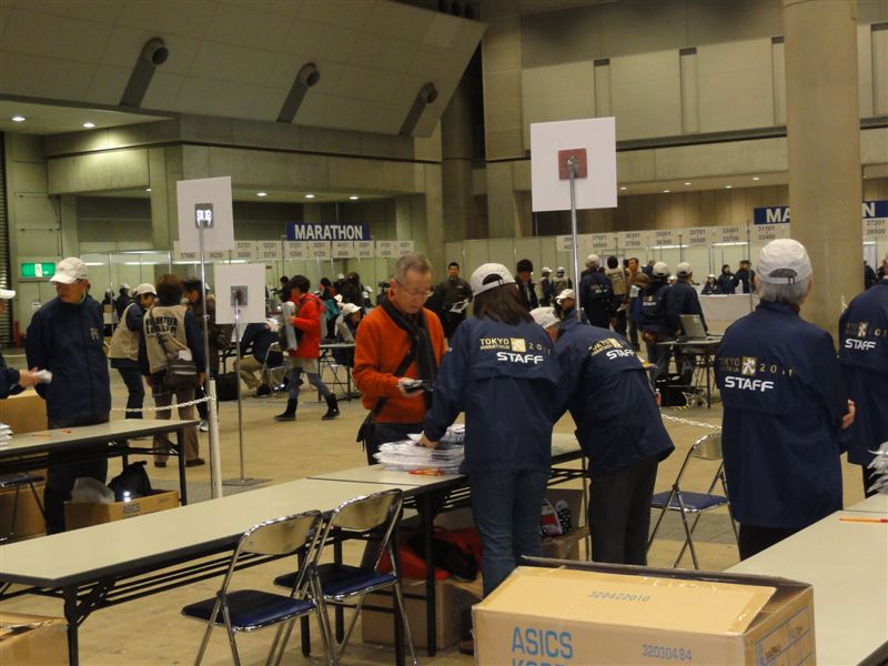 ゼッケンNo.のKは最終列のスタートブロックなので20~30分号砲から遅れそうだ。ランナー受付は並ぶことも無くスムースに終わ りゼッケン、ICチップ、記念TシャツなどをいただいてEXPO会場へと入っていきました。