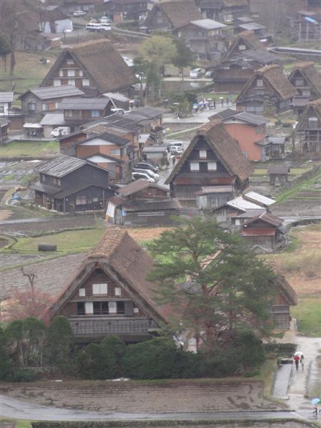 雨が降っていますが見通しは悪くありません一番手前の合掌が重要文化財の和田家ですね。