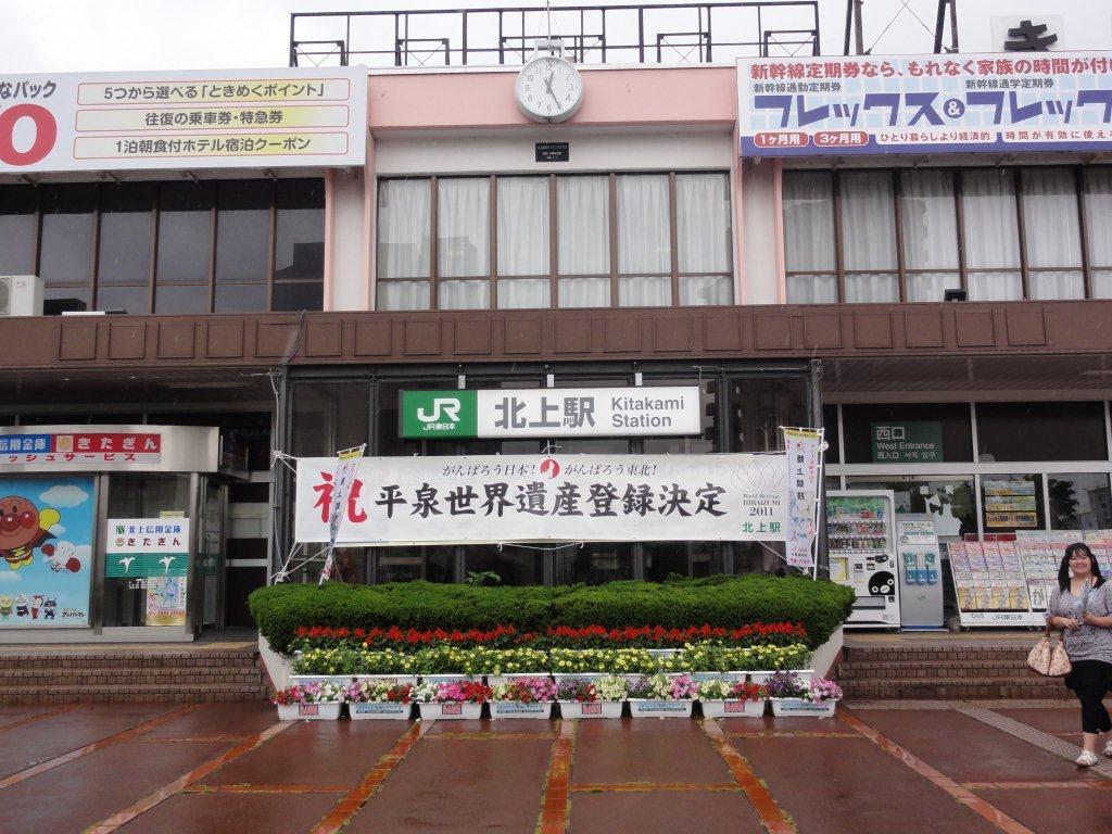 気仙沼でボランティアをする組と、別の温泉に行く人や他の予定がある人たちを北上駅に6:00送りに行き、8時からしかガソリンスタンがあいてなく開店を待って4台分のガソリンを満タンにしてレンタカー会社に返却した。駅を見ると早速平泉世界遺産登録決定の横断幕が掲げられていた。