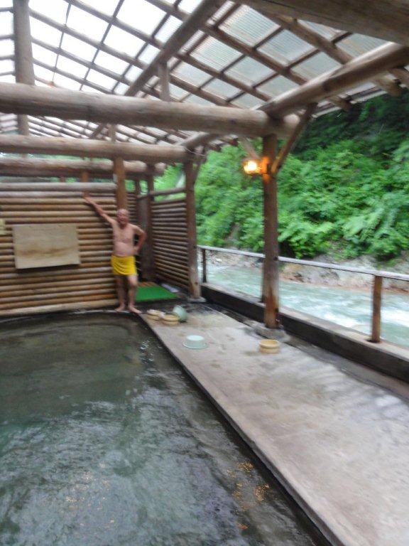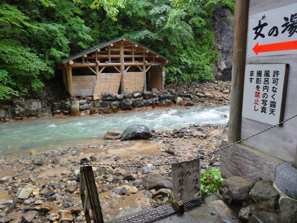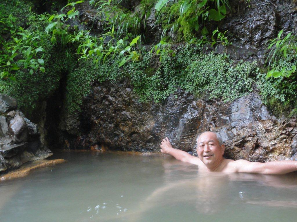 最後まで夏油温泉に残った3人はまだ入っていない露天風呂に行くことにした。川向こうの女の湯は川の増水で渡れないので入浴できず残念であった。