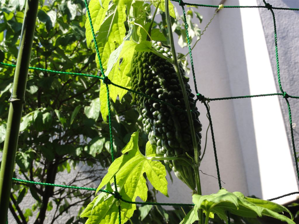 5月6日に植えたゴーヤが大きく育ってきたと6月20日の日記に書いたが(こちらの日記)身が大きくなってきてそろそろ収穫収穫できそうだ。ゴーヤは雄花と雌花があり同時に咲かないと交配できず実がならない。