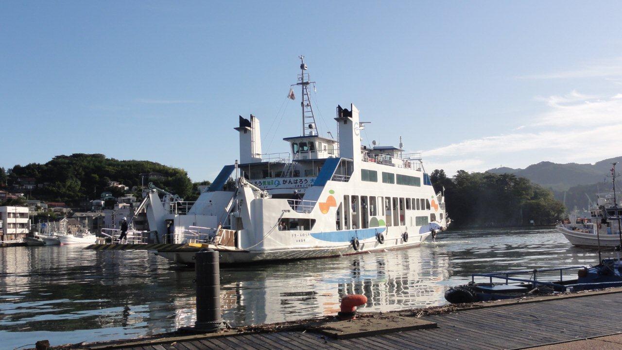 7:20発のフェリーボートがやってきました。広島からの災害援助で大島汽船に寄贈されたフェリーです。