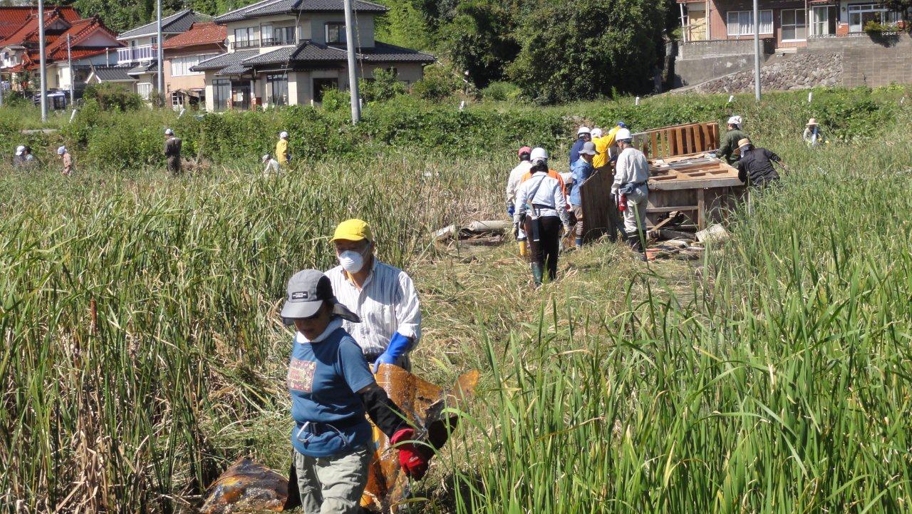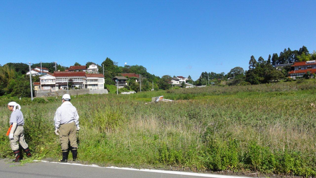 草を刈って瓦礫を見つけやすくしその瓦礫を片付けていきます。草刈と瓦礫片づけを分担し総勢70人くらいでの作業ですがみんな泥沼にてこづっています。