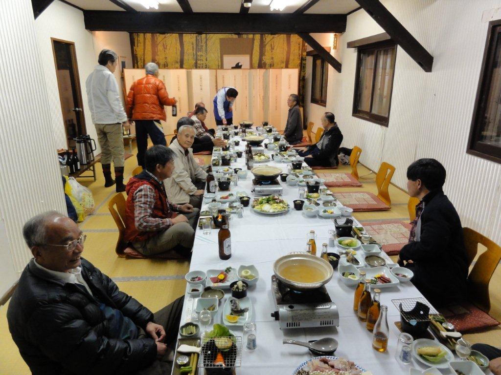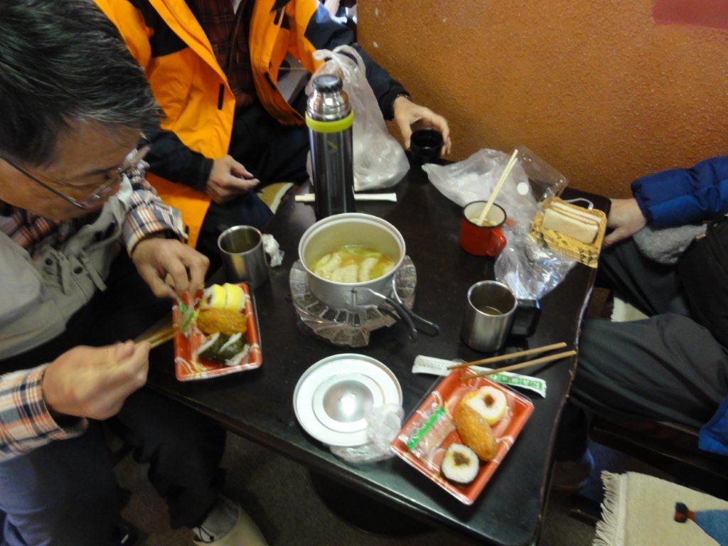 当初の計画では『美しの塔』で水餃子などを作り昼食の予定でしたがこんな寒いところ(-4度くらいでした)で・・・との意見で宿のロビ ーでの昼食となりました。 宿の土間で持参のコンロとコッフェルで汲んできた黒耀水で水餃子を作りおいしく頂きました。