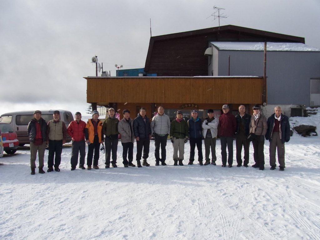 宿のおばさんに全員に記念撮影を頼みました。今日は雲が多く茶臼山に行く予定でしたが寒いし眺望は良くないので下山する ことにしました。