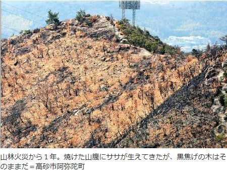 姫路、高砂、加古川の市境に跨る高御位山は播磨アルプス(場所はこちら)とも呼ばれ、杉、ヒノキの 植林がないことから展望が良く家島諸島を眺めながのハイキングコースとして人気がある山であったが約119haを焼いた1年前の2011/1/24大規模山林火災の発生か ら丸1年となったが山腹には今も黒焦げ状態のようだ。(写真は神戸新聞より借用)火災は高砂市阿弥陀町の鷹巣山の山頂付近で出火し高御位山や、姫路市側の山 腹にも燃え広がり消防や県、陸上自衛隊が消火に当たり住宅への被害はなかったが鎮火までに122時間を要し山は丸焼けになってしまった。しかし昨年から緑を取 り戻そうと高砂市は植樹計画を進めドングリの実から育てた苗を山に植える「どんぐりんぐ大作戦」を企画しNPO法人高砂キッズ・スペースが協力し2011年10月 に山でドングリ300個を拾い10の小学校の学童保育所で児童らが育てている育てた苗は、2年後に山に植えることを目指しているとのこと。長い時間がかかるが学 童が大人になったころにはその子供たちが美しい播磨アルプスをハイキングしていることだろう。