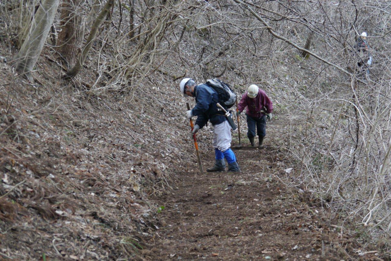 新聞記者さんや、環境省のレインジャーを作業場所に案内してきました。写真はB班の亀山北斜面の周回遊歩道です。3人肩組んで歩けるぞと自慢げに作業をしていました。