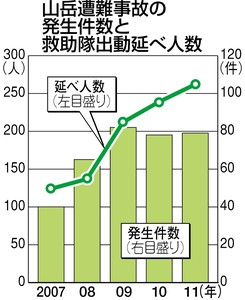富士山や南アルプスなど登山客に人気の山々が多い静岡県内で、県警山岳遭難救助隊の出動人員数が昨2011年、過去 最高を記録したそうだ。原因は、登山ブームで装備が不十分な登山客が増えたほか、ベテラン登山者が単独で山に登 り、行方不明になるケースも多いようだ。救助隊の2011年の出動回数は45回で前年年より4回少なかったが、行方不 明者を長期間捜索したケースもあり、延べ出動人員は262人と統計が残る1973年以降で最多だった。死亡、行方不明 の11人は全員が単独登山者で行方不明者はいずれも登山計画が提出されておらず、どの登山道を通ったのか分からな いので発見は難しかったとのこと。遭難事故の半数近くは、7~8月の富士山に集中し軽装の観光客、体調不良でも無 理をする登山者が後を絶たないのが現状のようだ。毎年繰り返される遭難ですが登山者はもっと慎重になってほしい ですね。