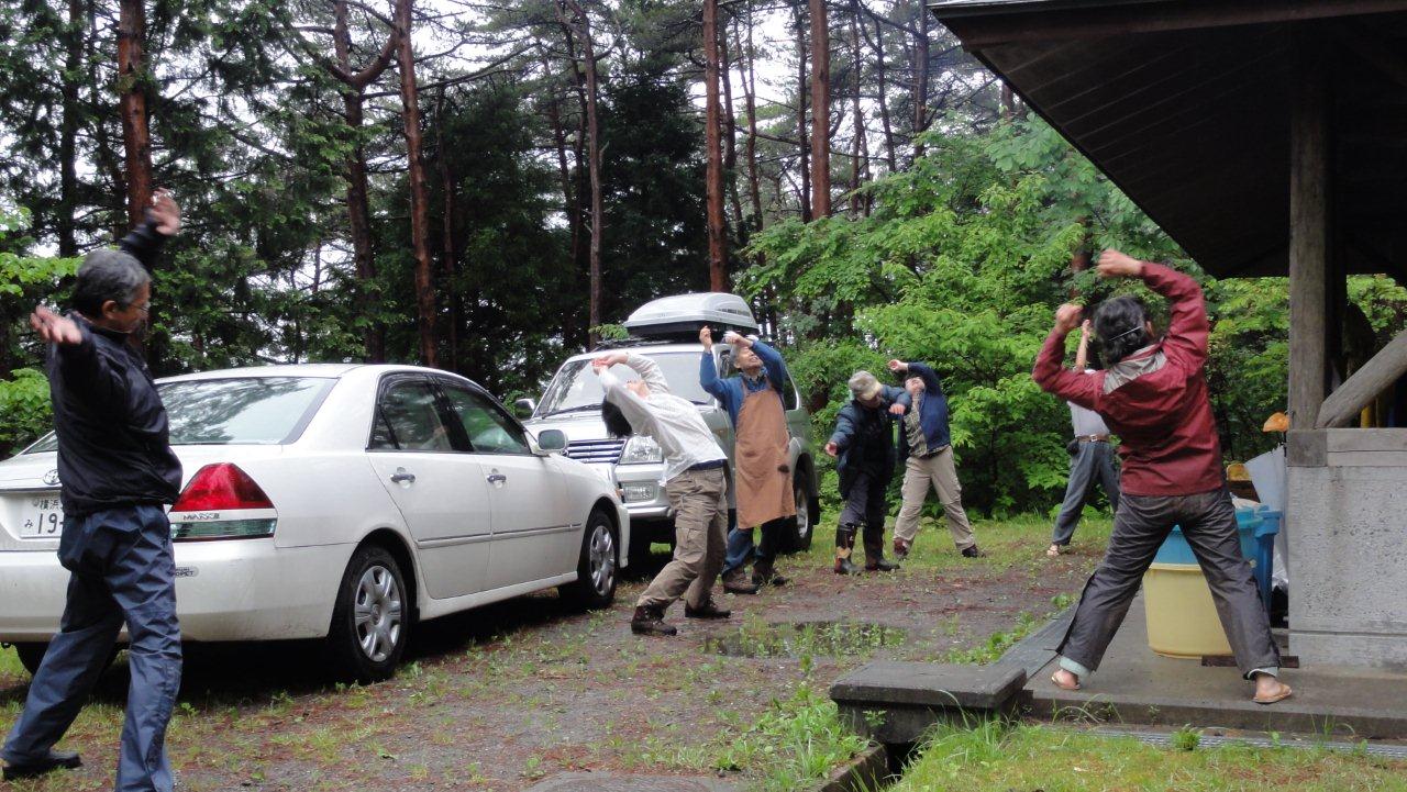 昨晩(16日)の夜は本格的な雨でテントに降る雨と音がやかましかったが運転の疲れや作業の疲れと程度のお酒でゆっくり眠れた。テント村の朝は早起きのIさんが4:30頃には起きて散歩して朝食を作っていてくれた。寝坊の私は6:00に起きたらすでに食べられるようになっていた。