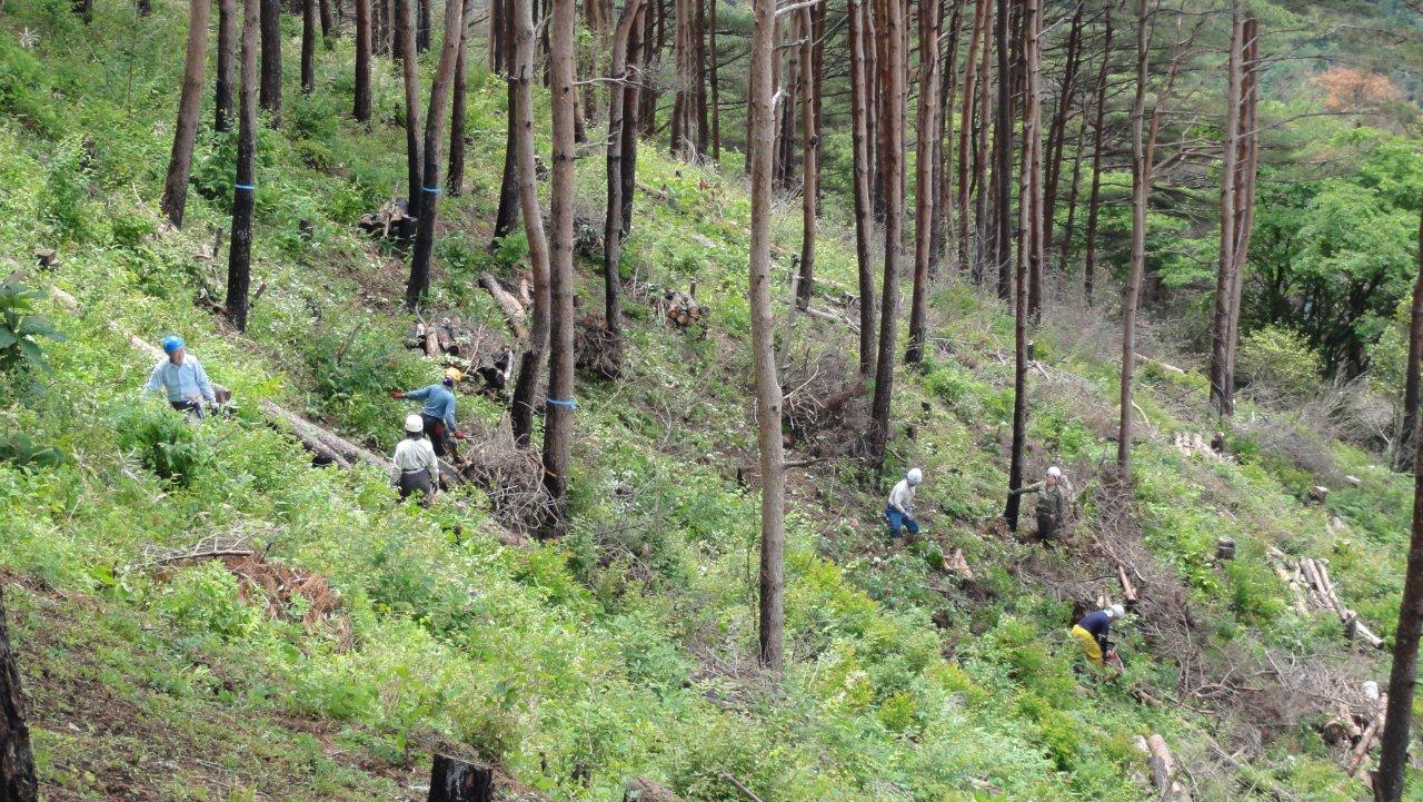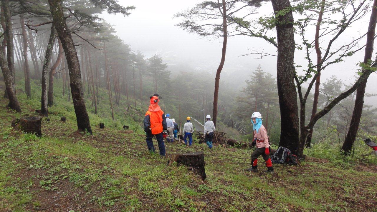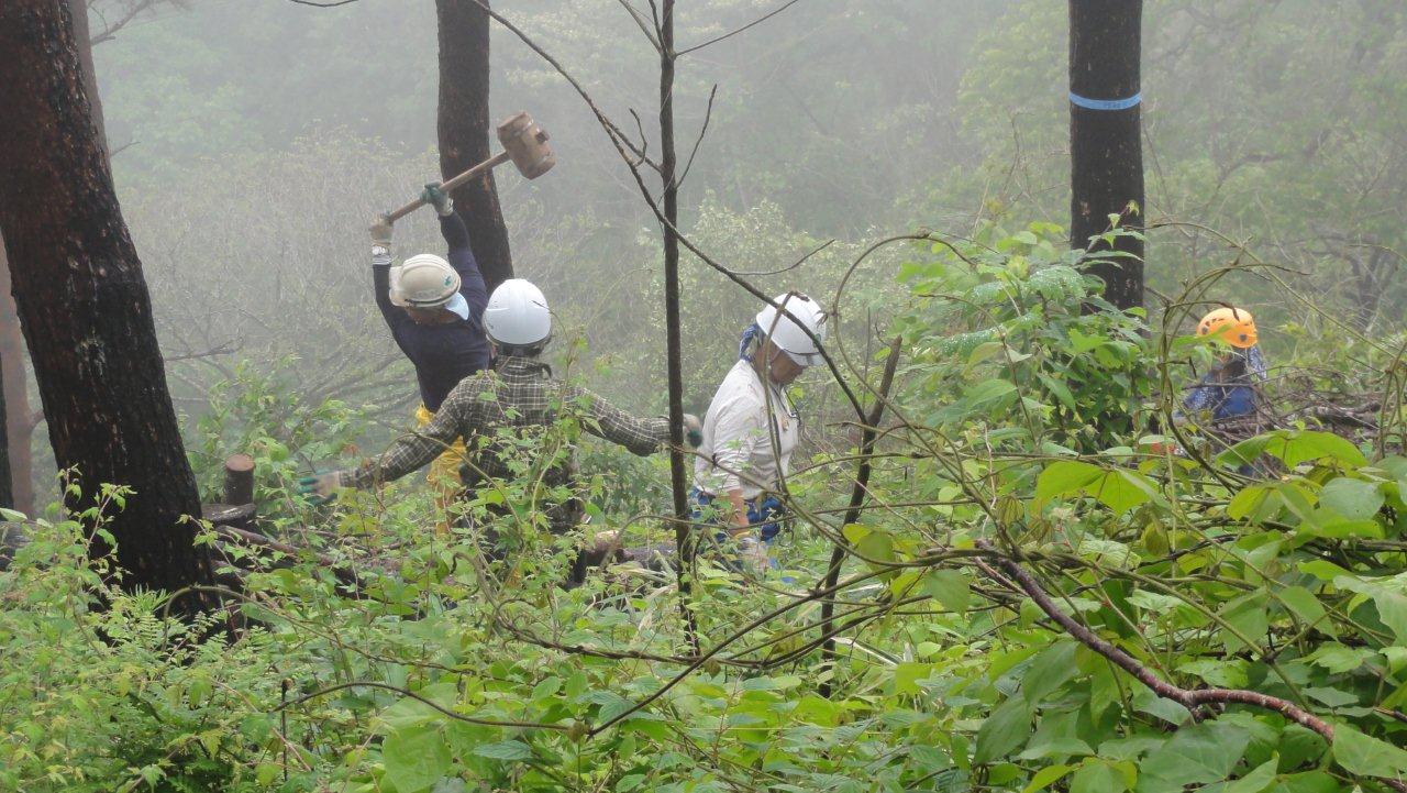 切った木が下の道路に落ちないようにくいを打ってとめます。急斜面で最新の注意と上下作業にならないよう声を掛け合って作業をします。
