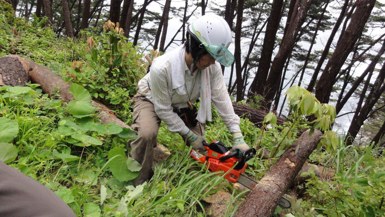 伐採中は倒れてくる木にあたらないよう遠くで見守ります。