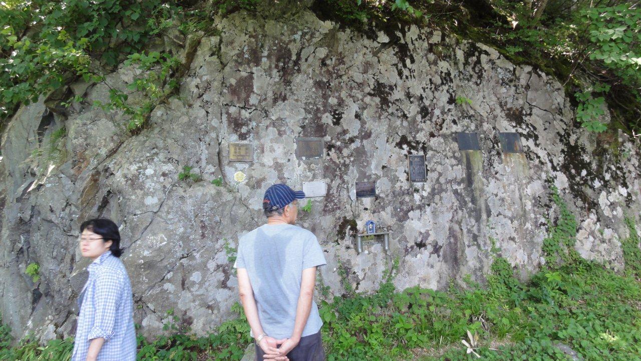 おなかもすいてきたのでここで昼食にしました。遭難下方の慰霊レリーフが岩肌に並んでいます。昭和40年代に沢山お方が遭難していますね。合掌。