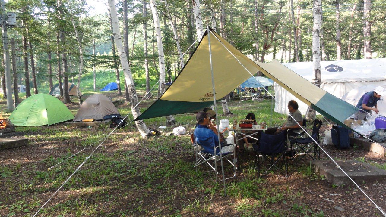 タープの下で早速乾杯です。いすも8脚、テーブルも持ってきたので快適です。