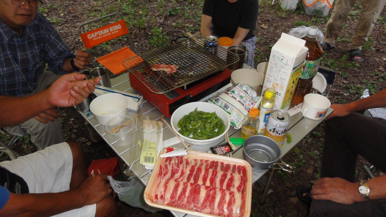枝豆、焼肉も出てきました。各自缶ビールやチュウハイ3本を飲み干すと日本酒の1升ビンが出てきましたが写真撮り忘れました。太陽も隠れいつの間にか暗くなってきました。