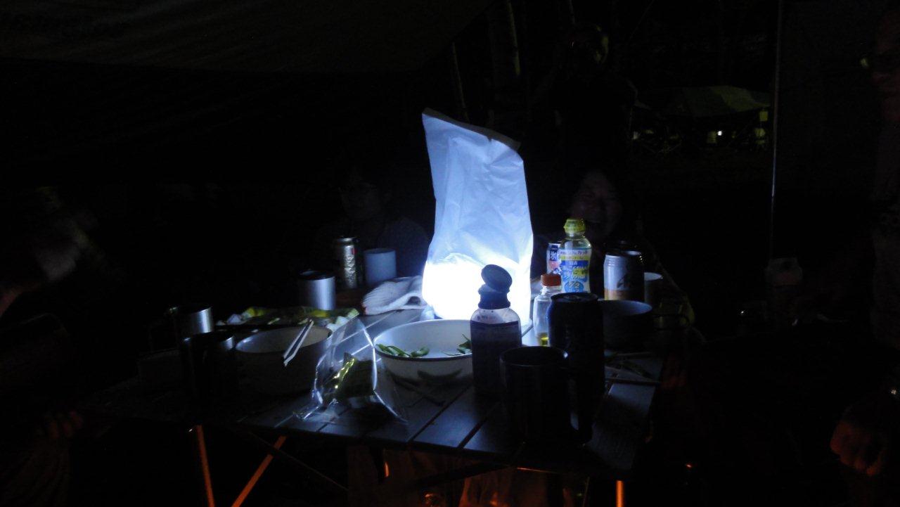 発光ダイオードのランタンの光はまぶしいのですがレジ袋をかぶせるとやわらかい光になりゆっくり歓談するには良いですよ。