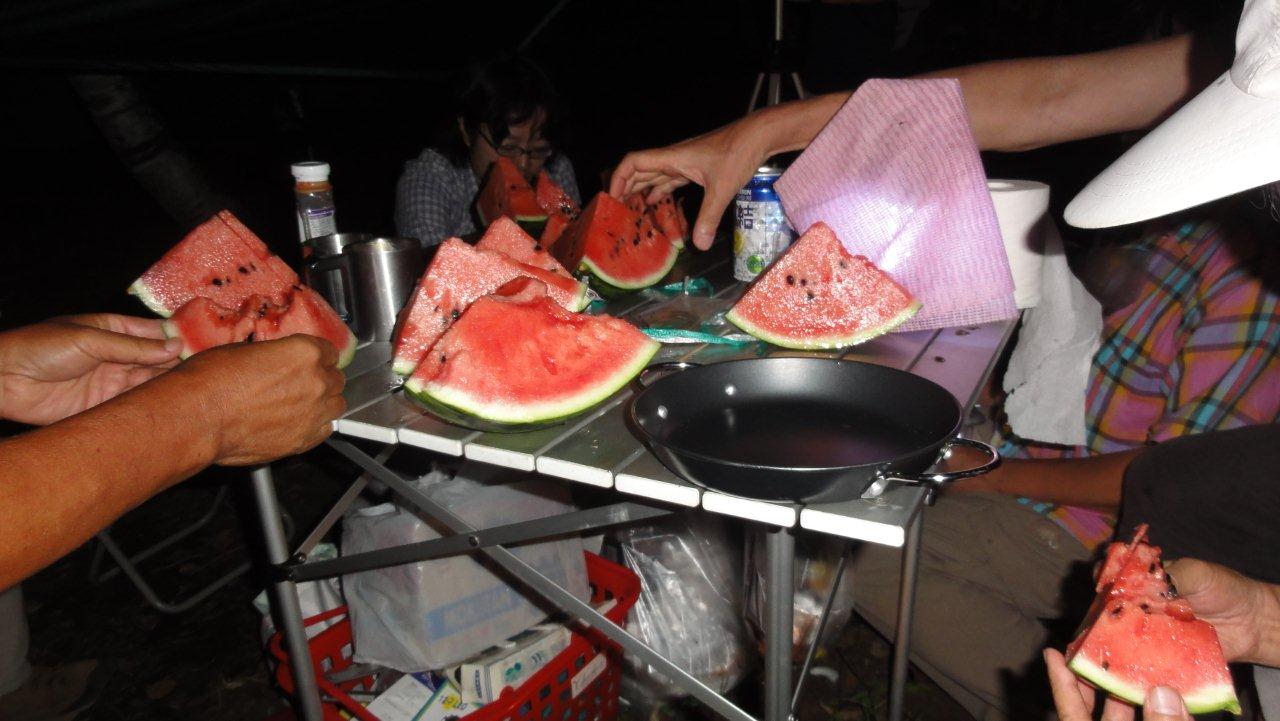 それでも仲良く分け合ってみんな満足です。後片付けをして最後はデザートです。冷たい水道水で冷やしておきましたが大丈夫かな。ああ~~山ガール2名写っていますね。初キャンプといってましたが満足そうな様子です。