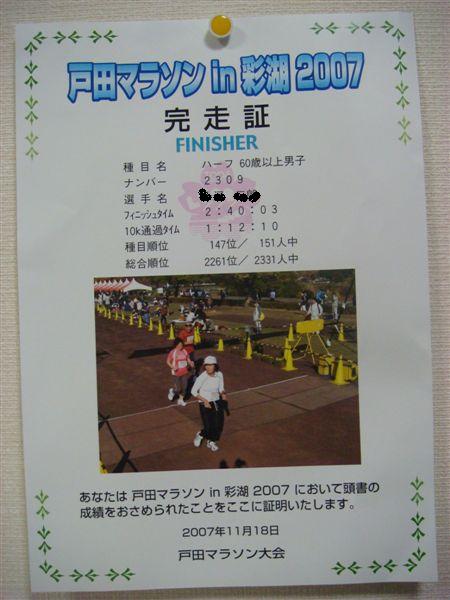 11/18に走った戸田マラソンの完走証が郵送されてきた。