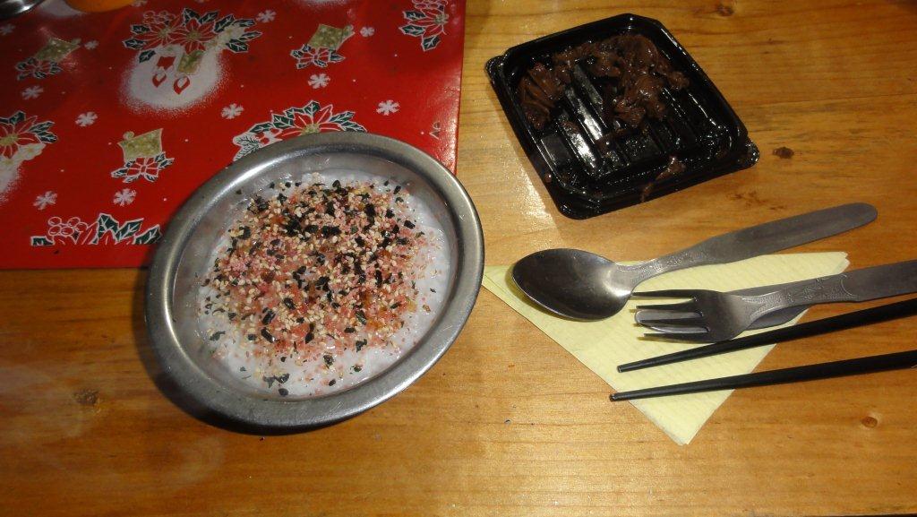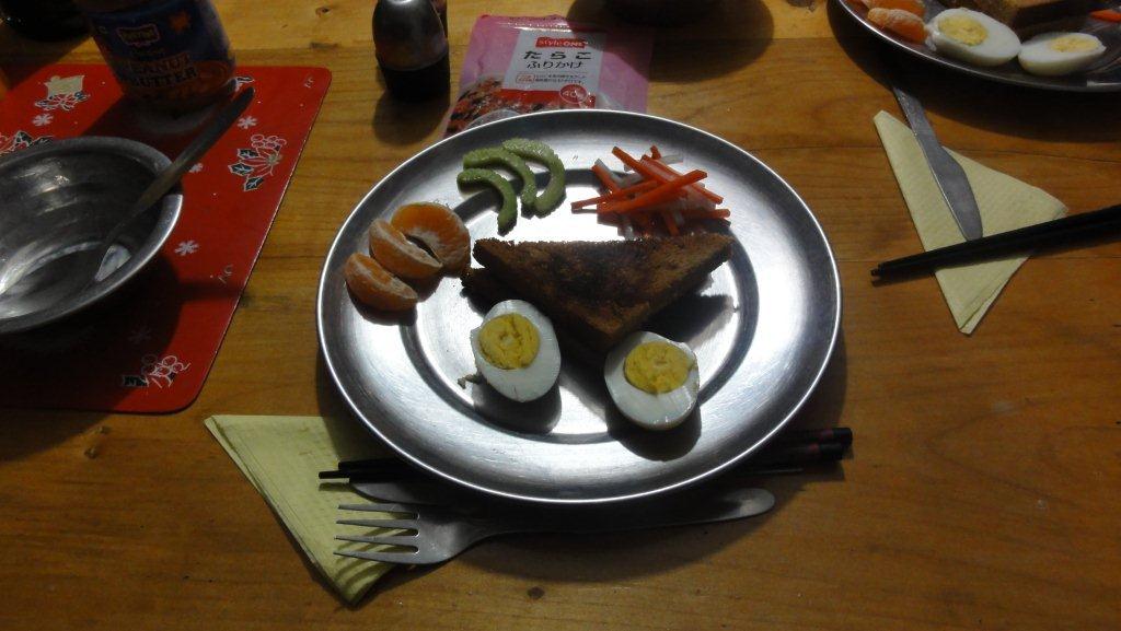朝食はおかゆが出ます。これは高山病対策にひつぉつで水分を沢山取るためです。トーストもゆで卵も出ますよ。