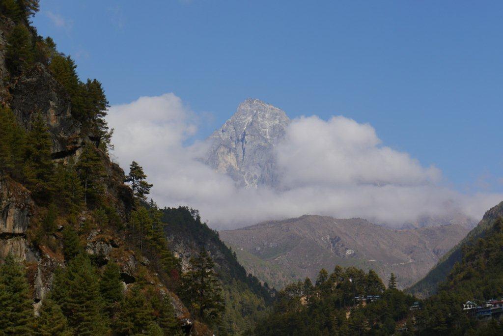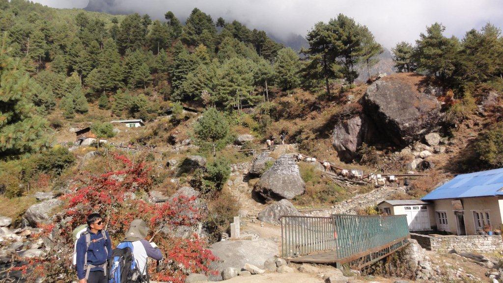 トレッキング2日目11月10日はパグディン2610mからナムチェ3440mまで約6時間の歩行です。吊橋を数回渡り国立公園チェックポストのあるジョサレへ向かいます。標高差600mの急な登りつづら折の道をゆっくり登りきってナムチェ村に入ります。