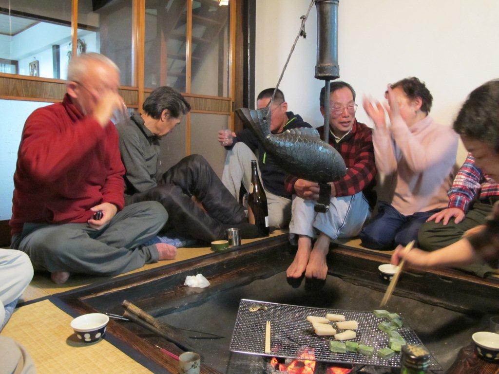 途中からは囲炉裏端へ移動してお持ちなどを焼いてまだまだ宴会は果てしなく続くのでした。