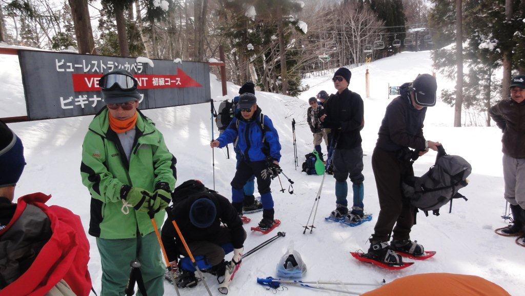 かみしろスキー場のリフトであがりスノーシューをつけます。