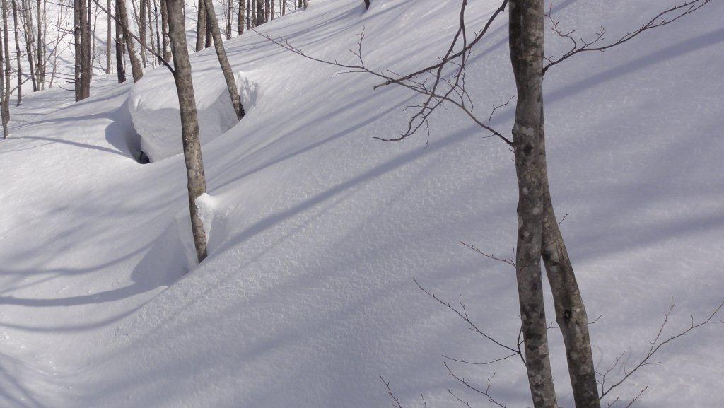 ゲレンデでは時折雪交じりの突風でしたが林の中に入ると穏やかです。