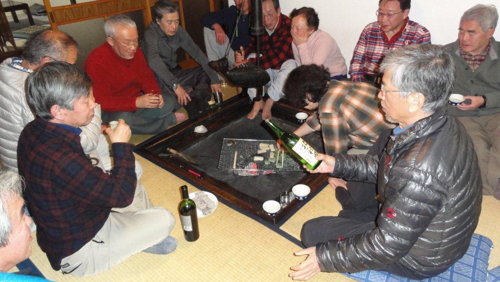 囲炉裏端ではまたまたいろいろ焼いてお酒のビンがどんどん空いていきます。