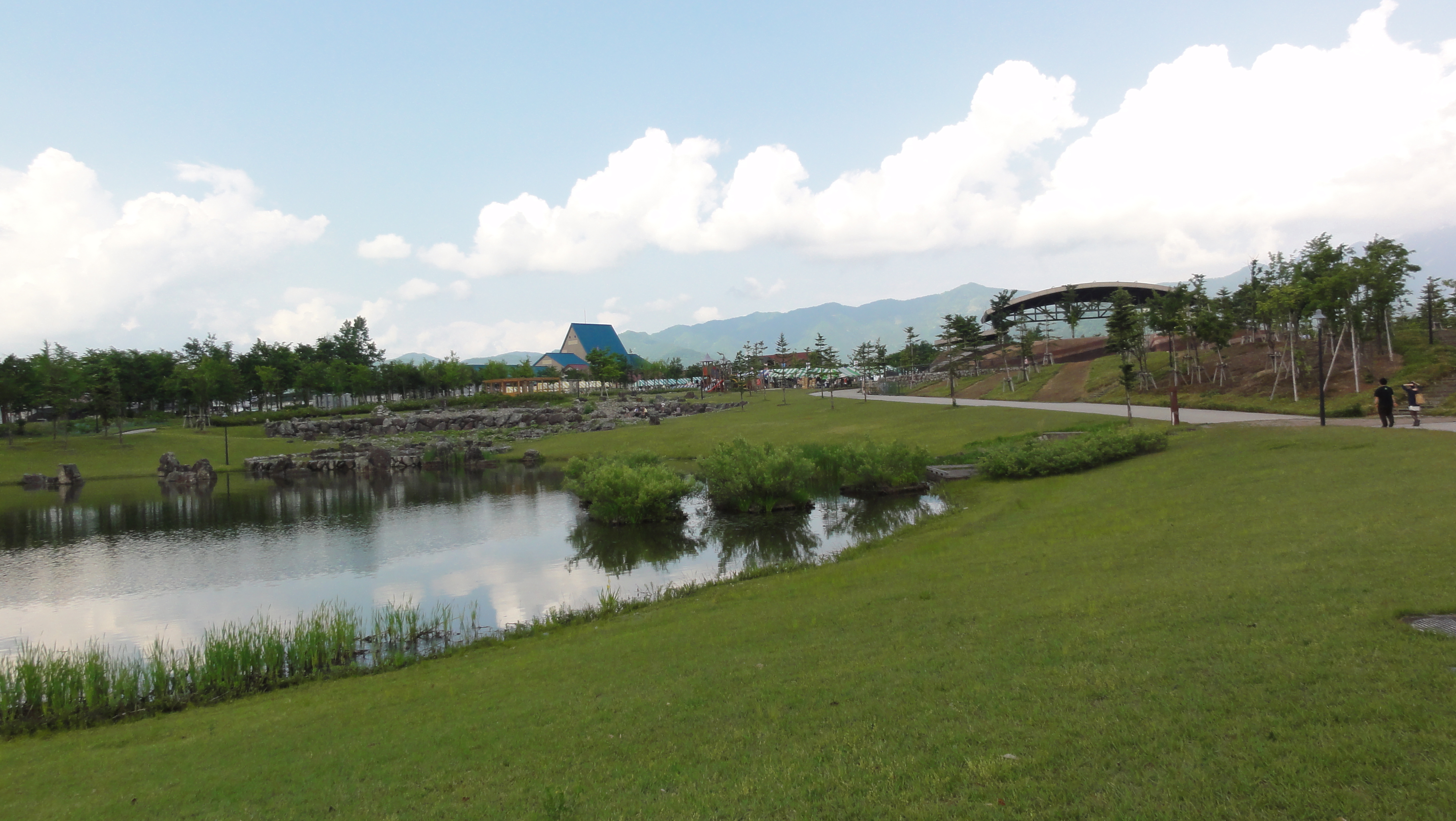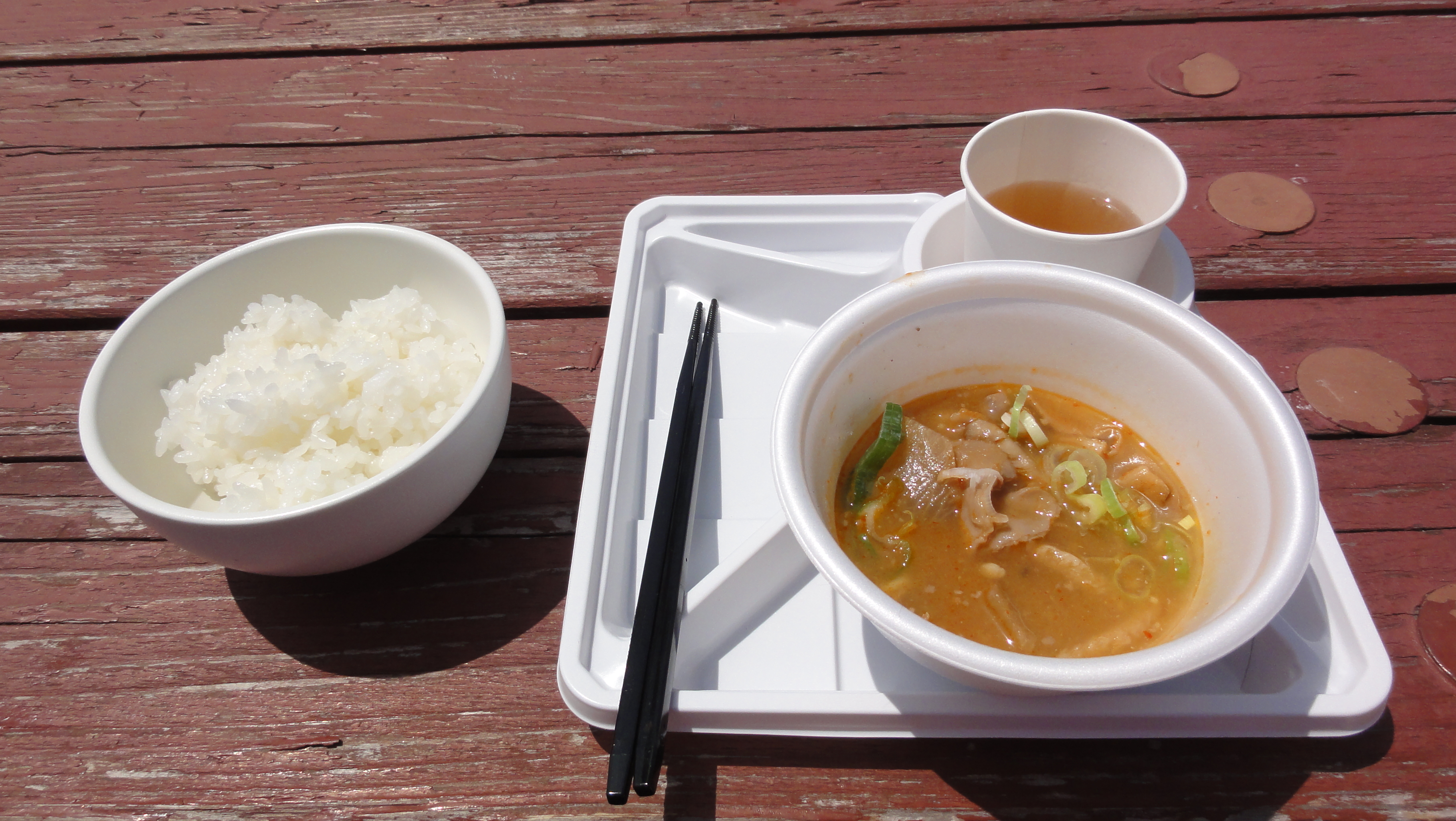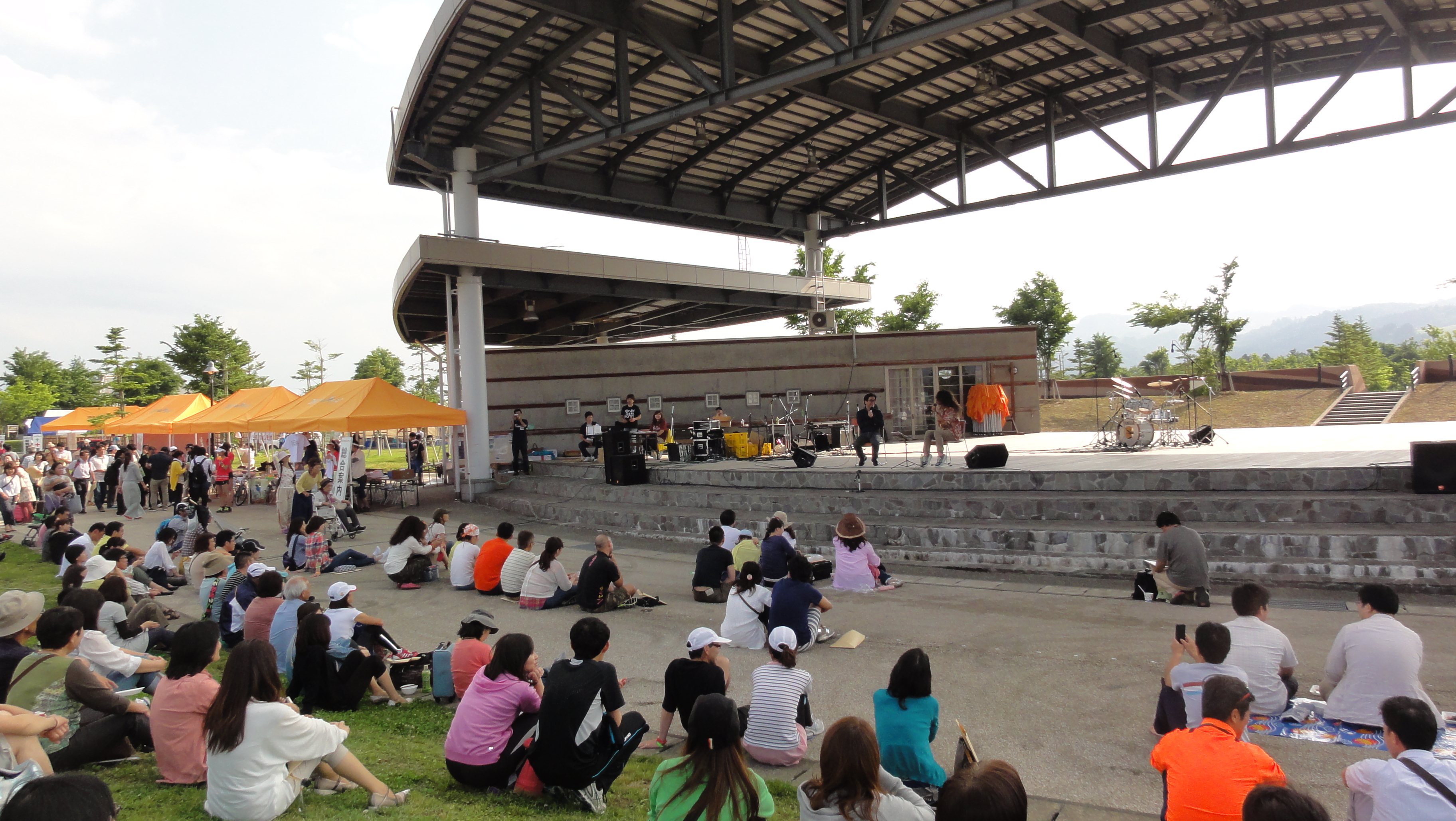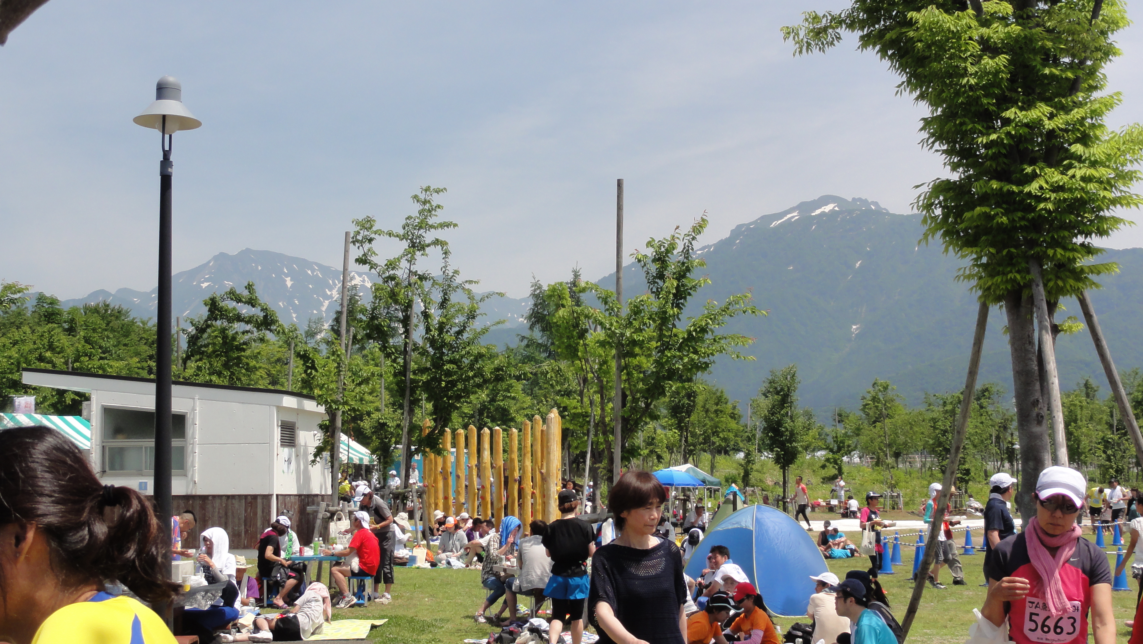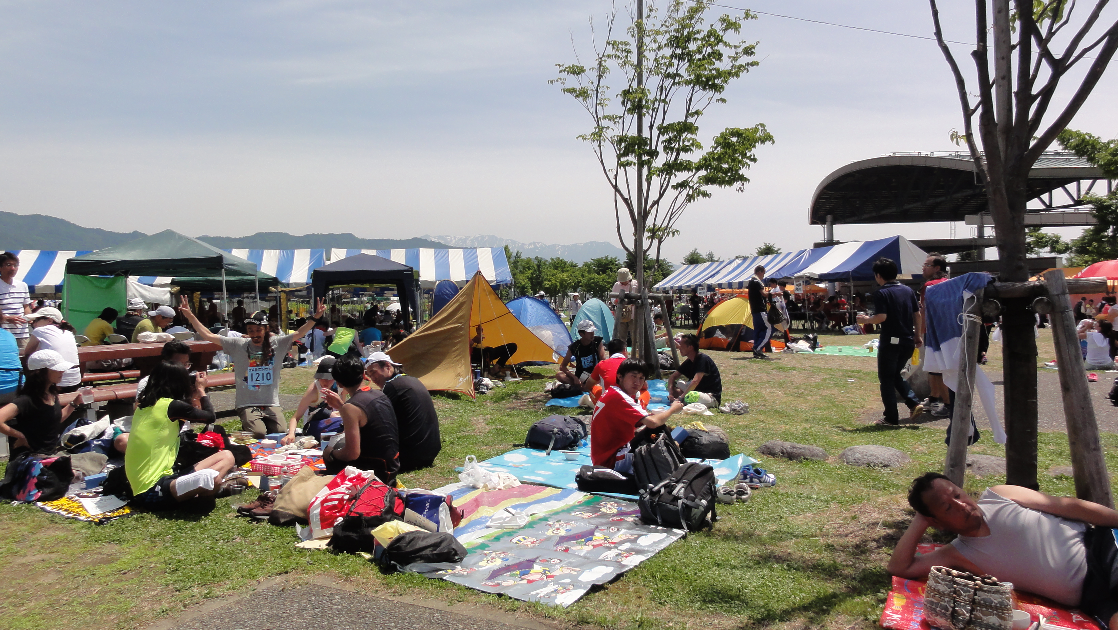 会場ではお茶碗に山盛りのごはんにグルメ村でのおかずで昼食を楽しんでいます。山々も美しくちょっと暑いけどさわやかな気分です。