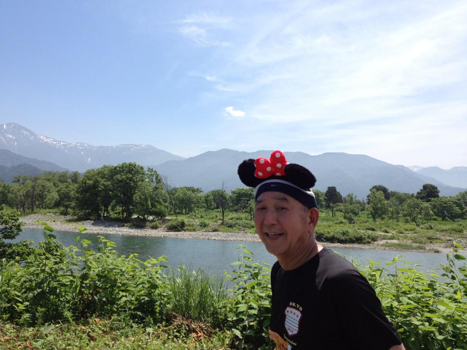 越後3山(八海山、越後駒ケ岳、中乃岳を見ながら田植えの終わった田んぼの中を走ります。(さなぶり祭りは田植えの終わったこの時期に行うそうです)残雪の山々が美しいのですが暑いです。しかし給水ポイントが2.5Kmおきにあり冷たくおいしい水とスポーツドリンクが用意されています。あたまから水をかけて走りました。