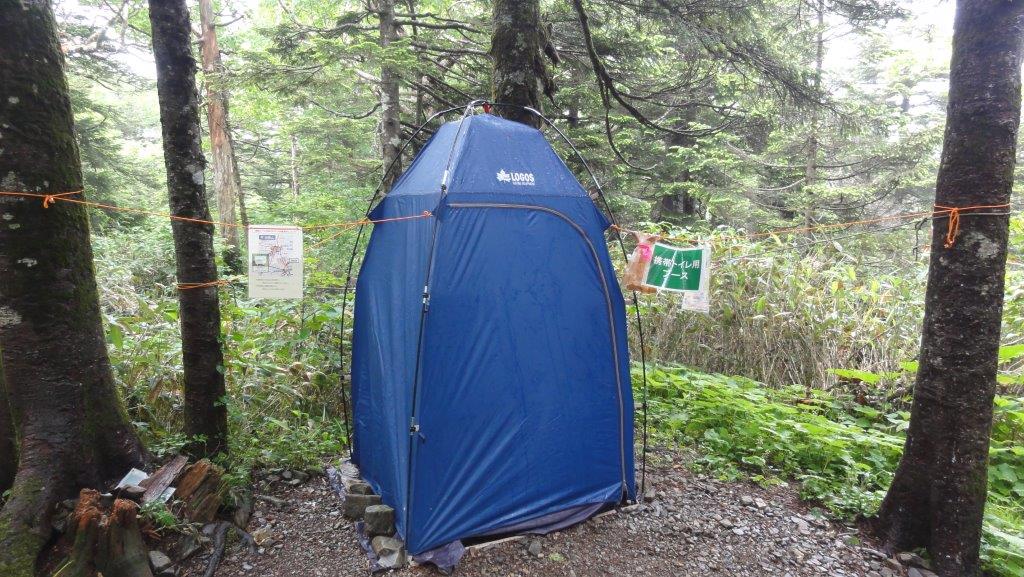 途中には携帯トイレ用の簡易テントも設営されてます。女性も安心ですね。