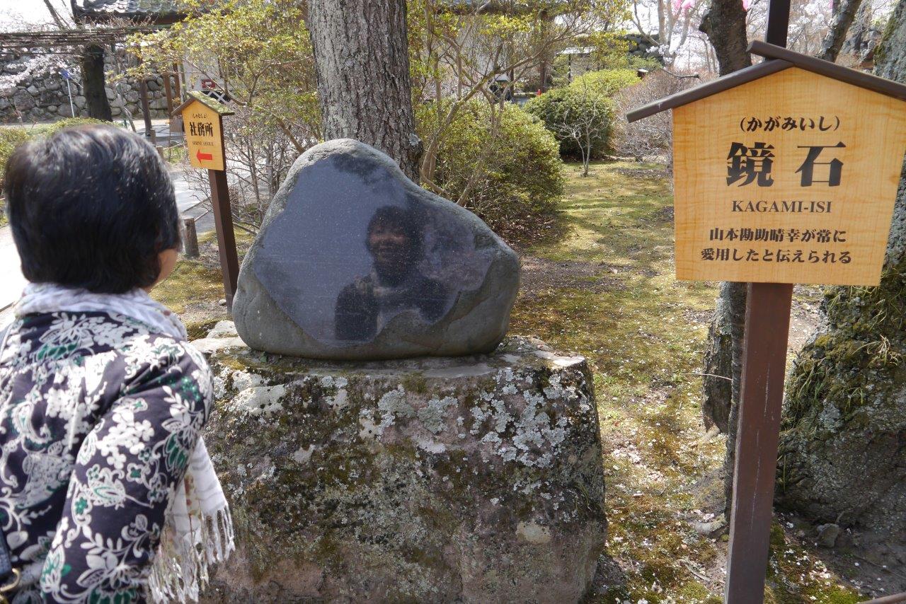 神社でお参りをして鏡石を見ましたが誰か写ってますね。本と鏡のようでしたよ。枝垂れ桜は満開でした。青空で気持ちがいいです。