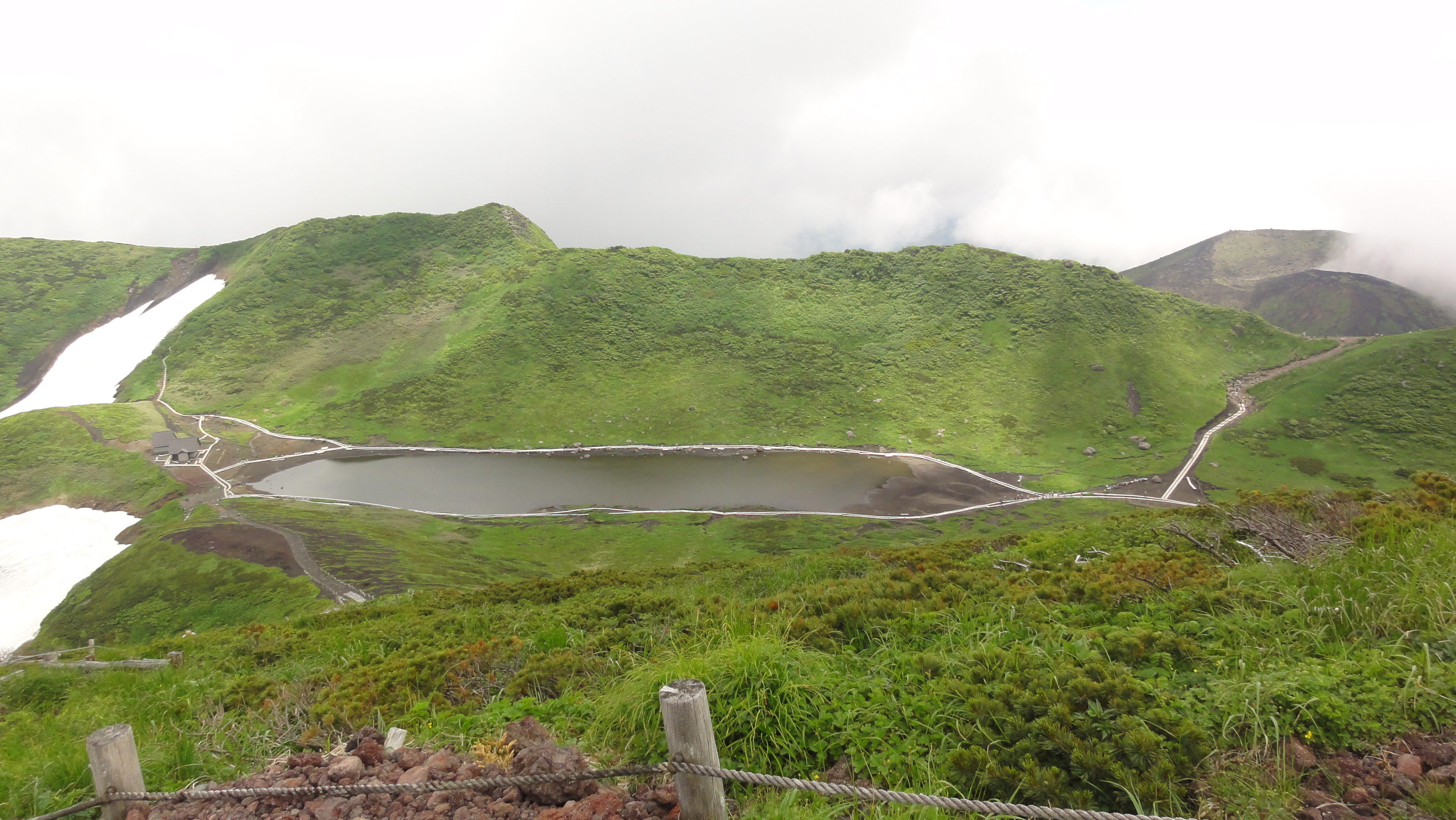 そして秋田駒最高峰の女目岳山頂です。阿弥陀池からは登りやすい階段が整備されていて助かります。山頂から阿弥陀池越しにこれから向かう横だけが見えます。