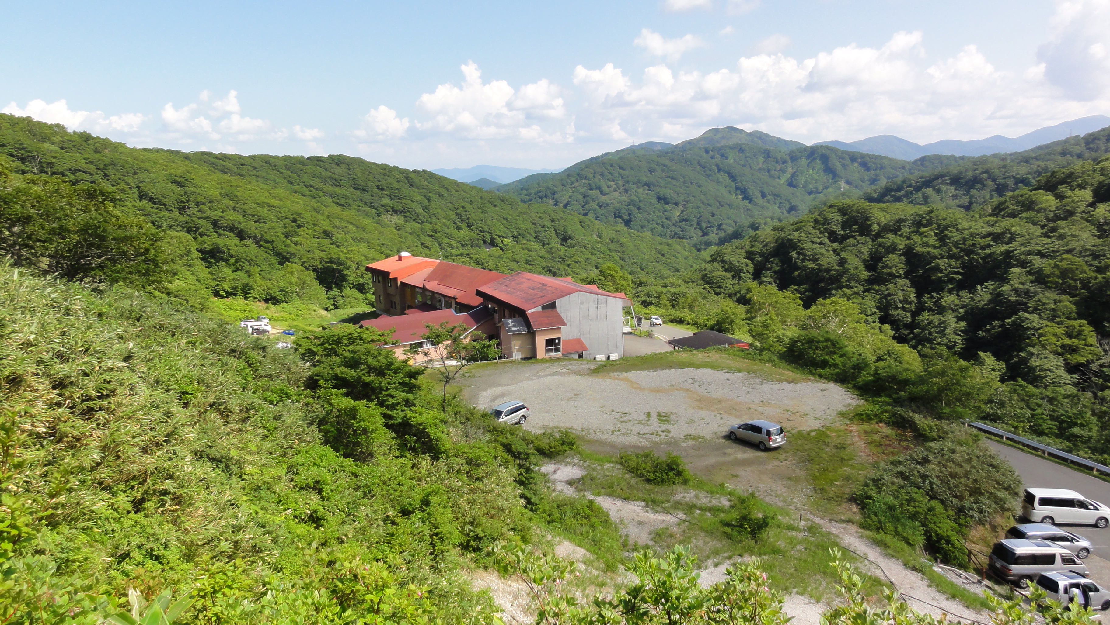 大焼砂の分岐からは来た道を下っていきます。国見温泉が見えてきました。宿について温泉で汗を流して食事の支度です。