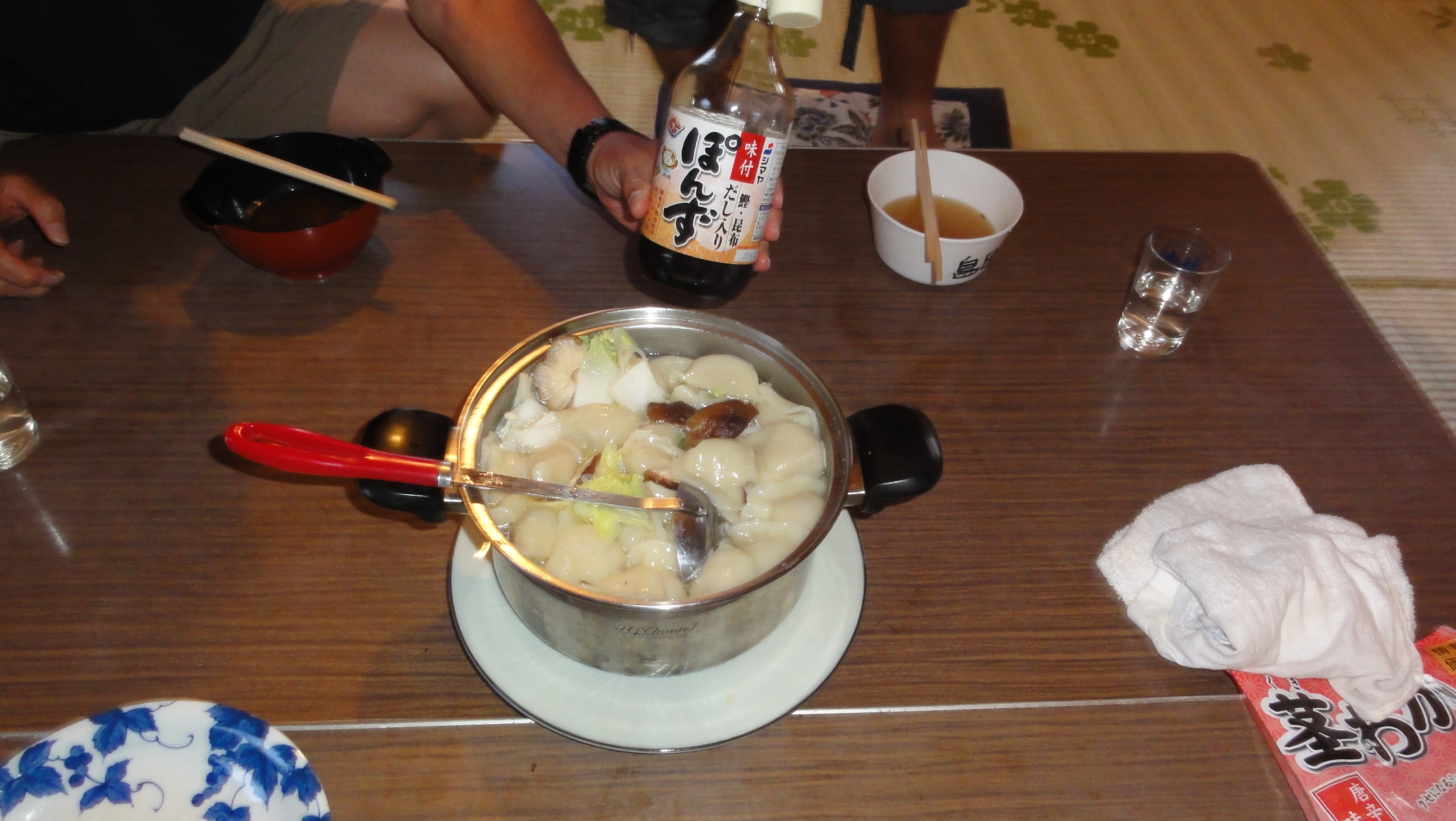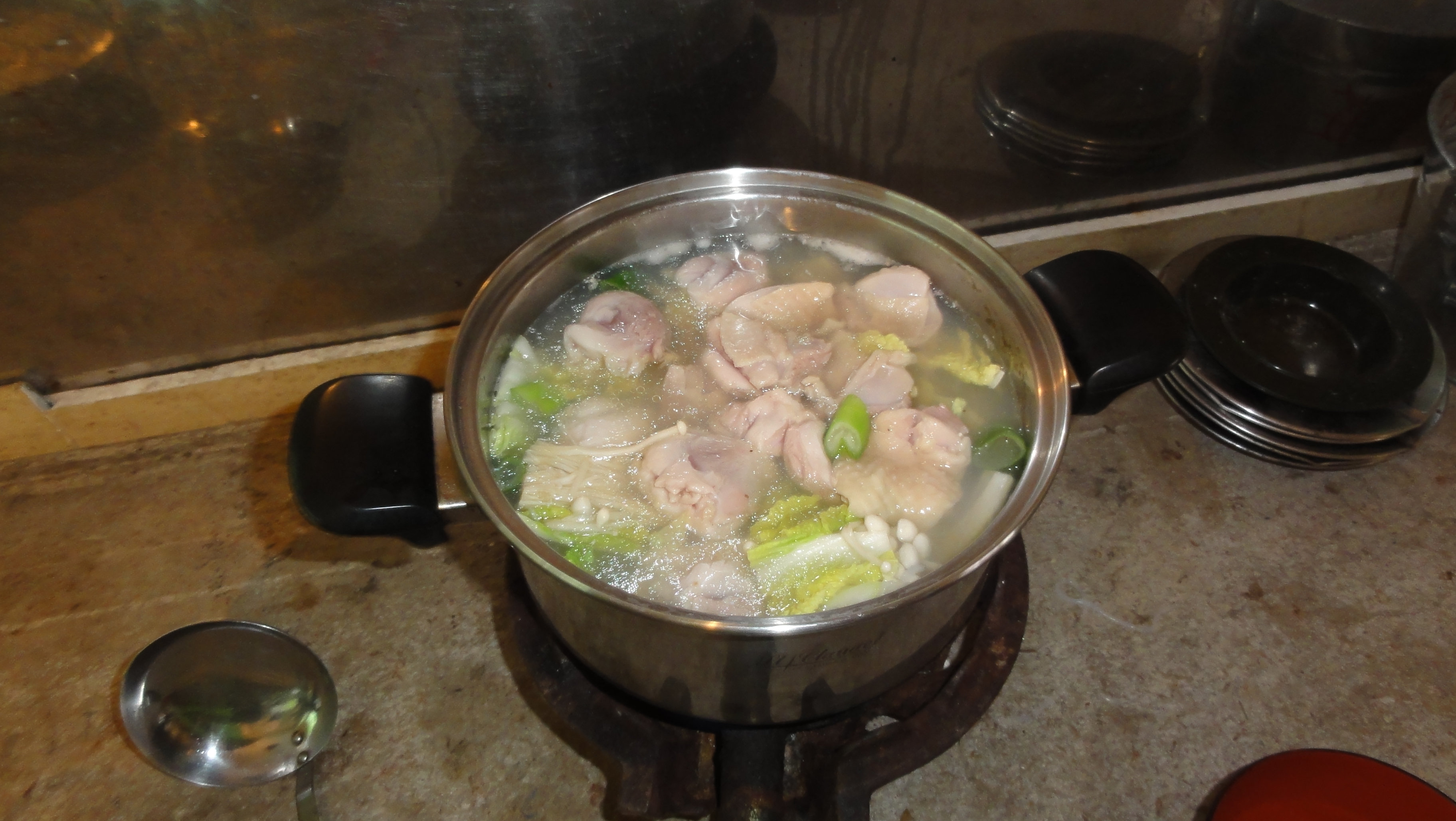 食事は今晩も手軽な鍋料理です。鶏肉と白菜、葱、きのこです。2回戦は水餃子です。