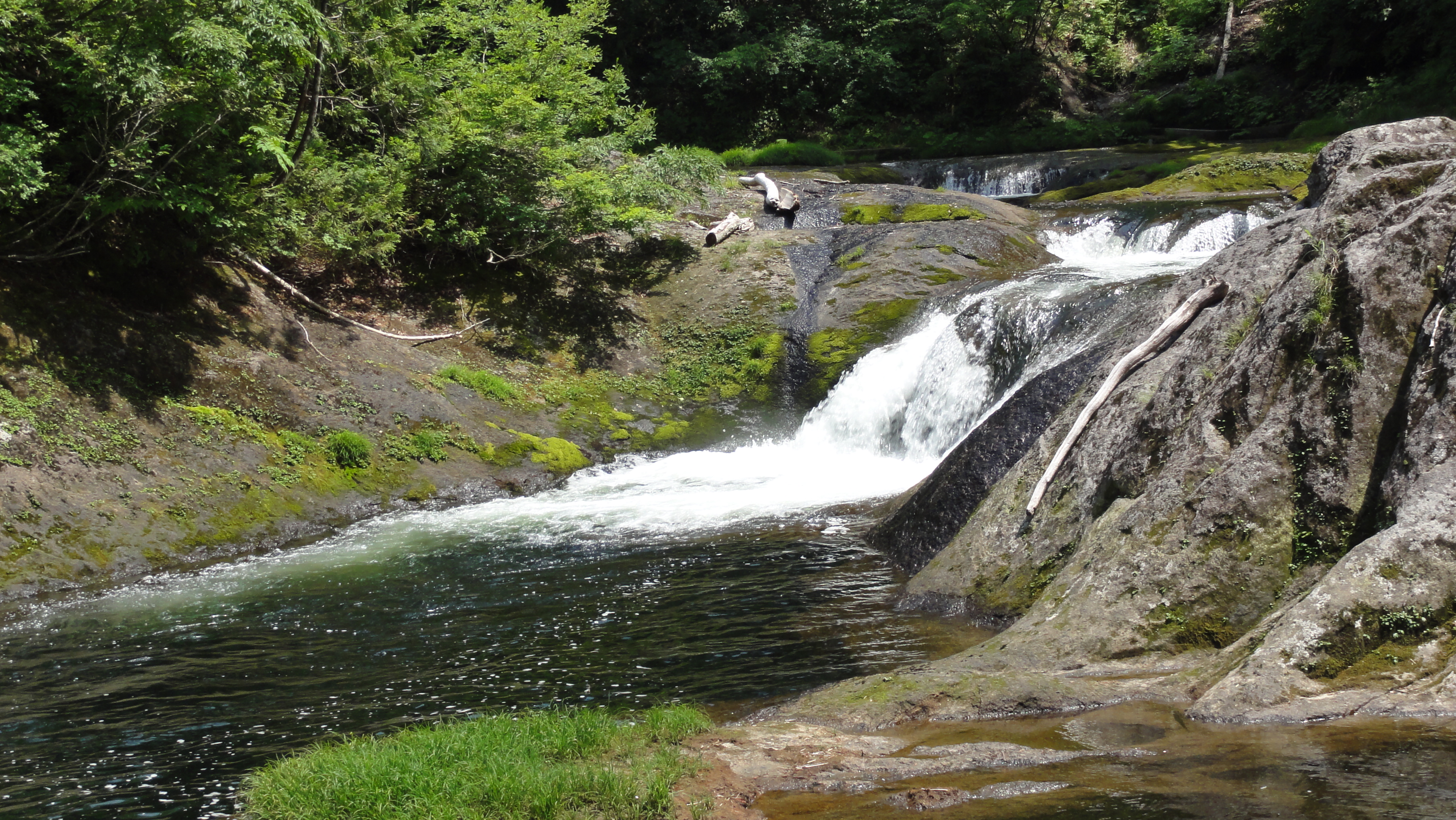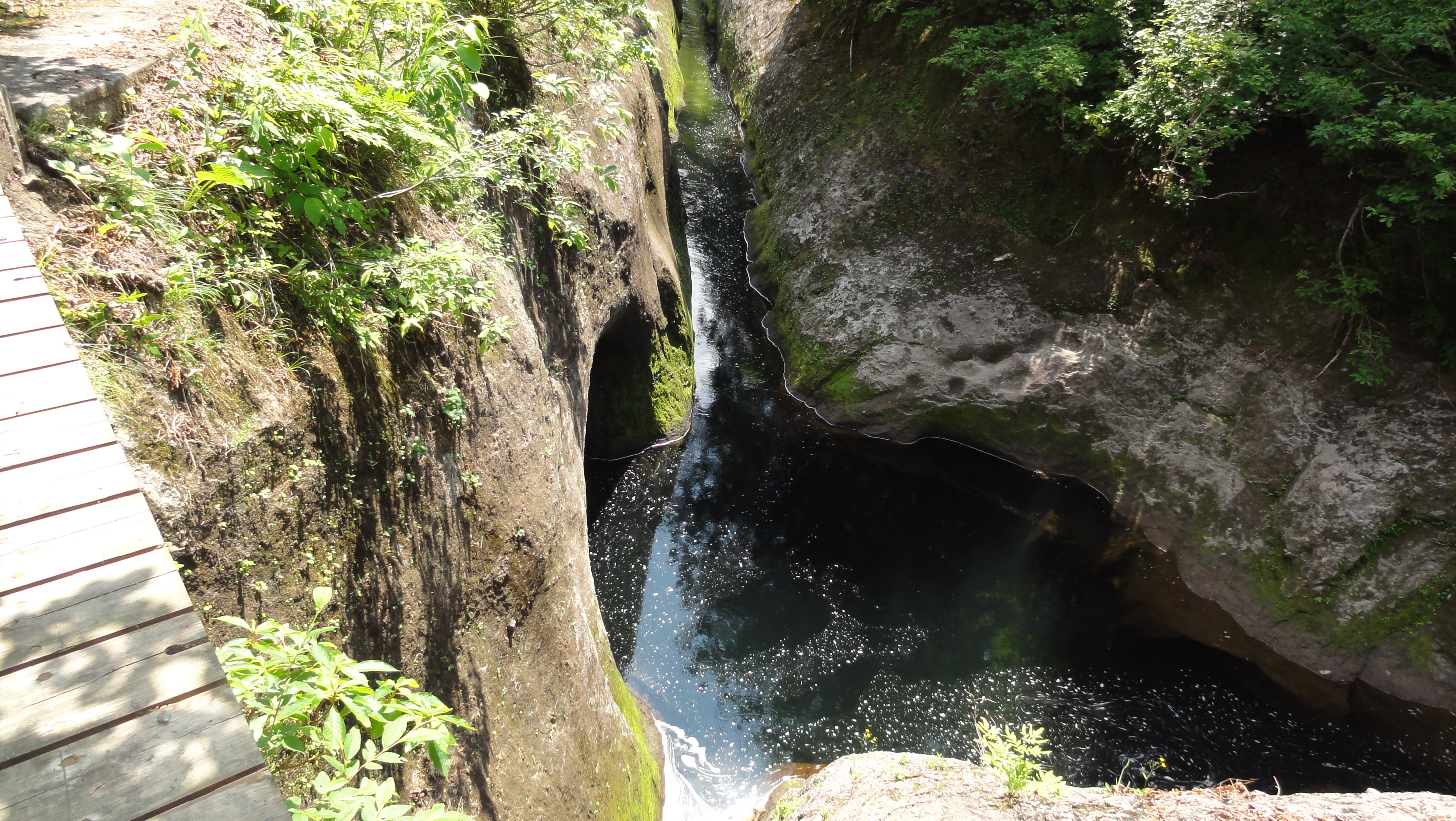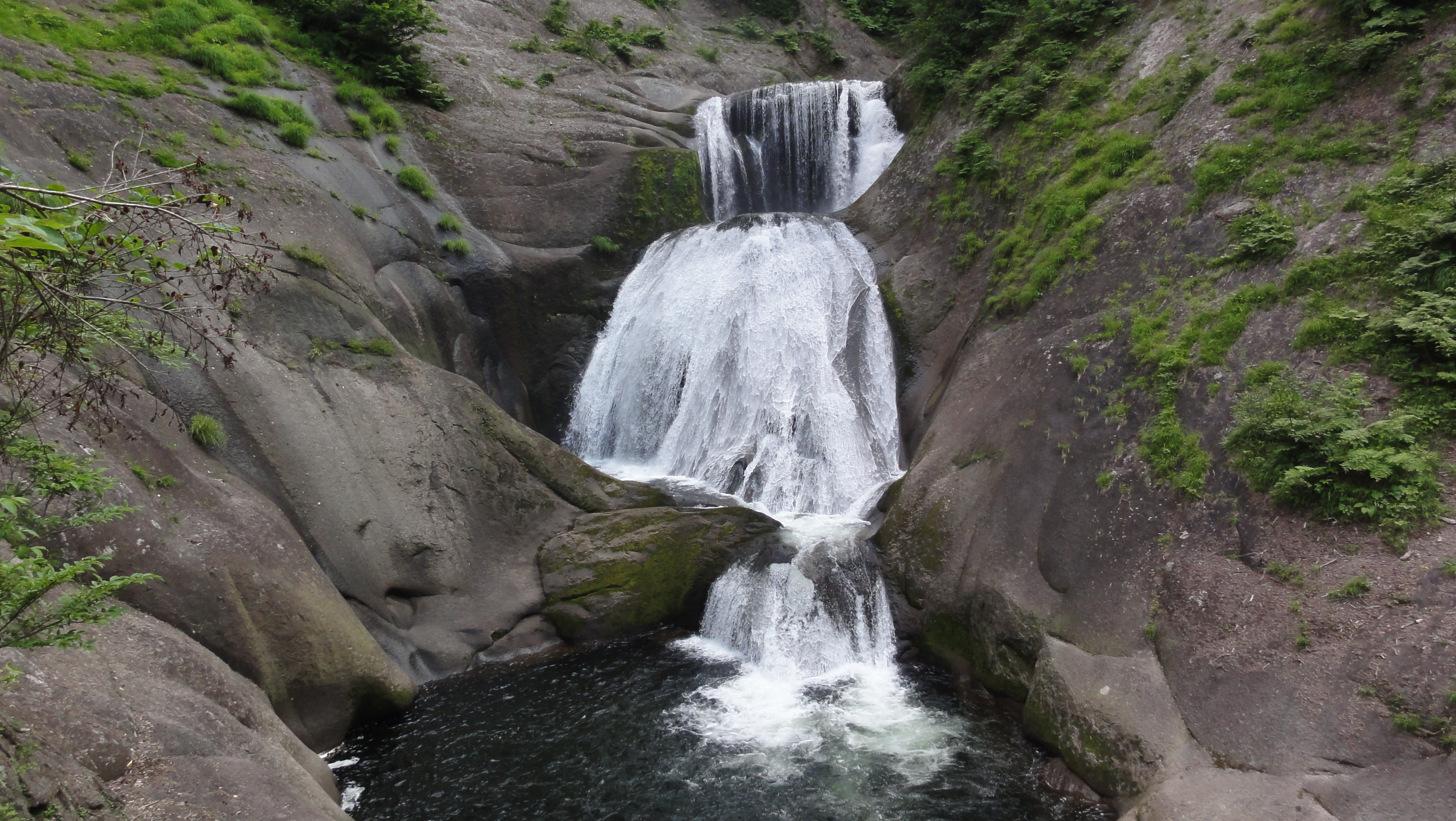 1.8kmの遊歩道が整備されており、横滝、曲滝、ガマ淵、三角滝、穴滝、化ノ淵、化の滝、化の堰、化ノ穴滝と個性あふれる滝が続き、遊歩道の終点に高さ20m迫力満点の「三階の滝」が現れます。それでは写真を拡大してみてください。