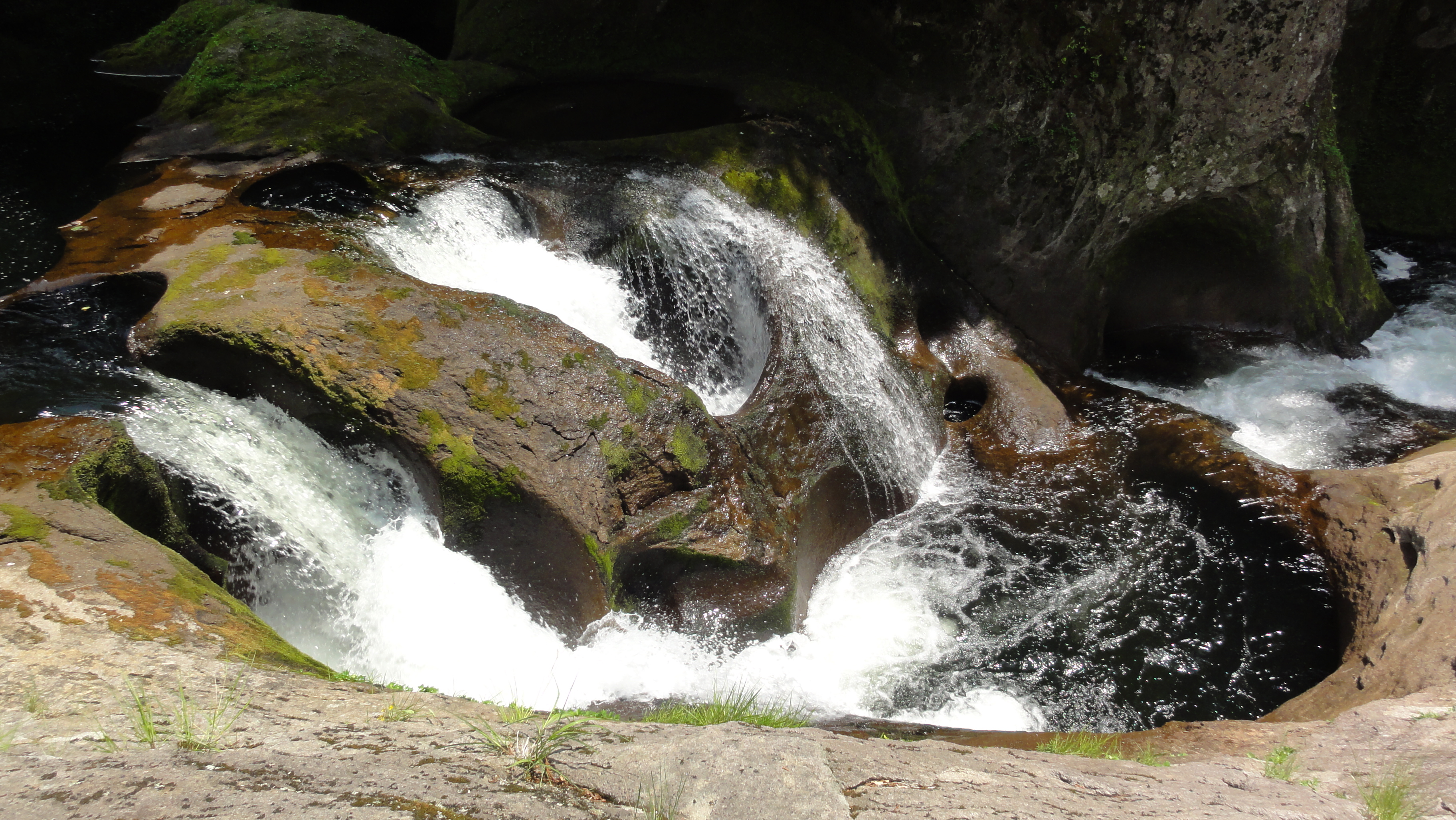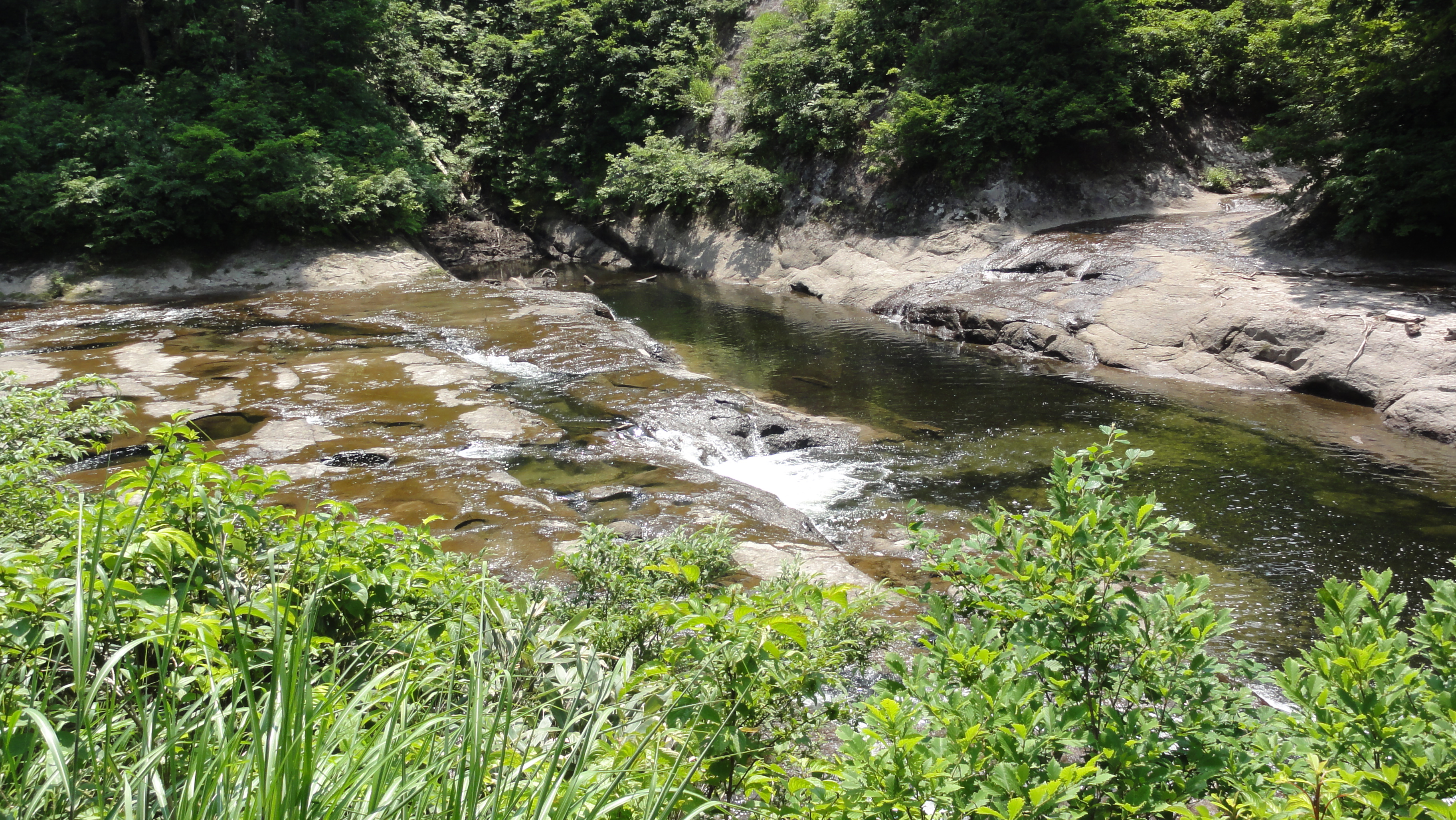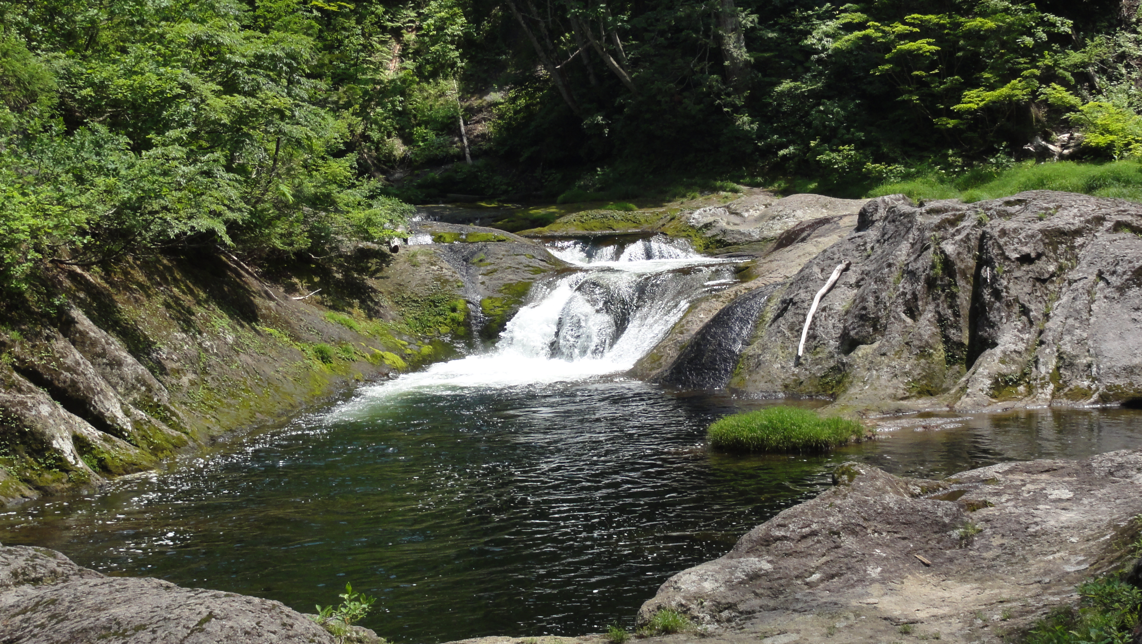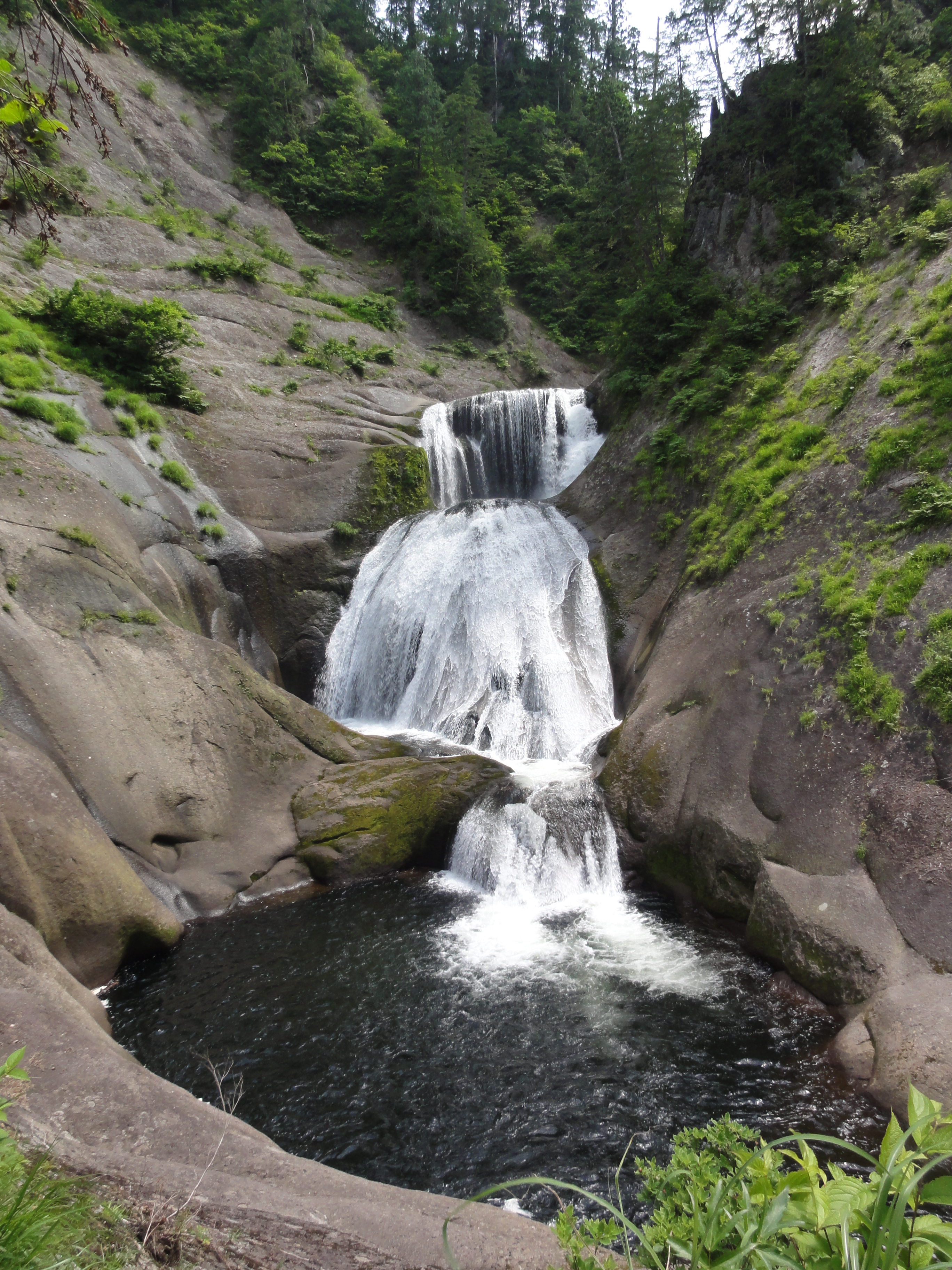 1.8kmの遊歩道が整備されており、横滝、曲滝、ガマ淵、三角滝、穴滝、化ノ淵、化の滝、化の堰、化ノ穴滝と個性あふれる滝が続き、遊歩道の終点に高さ20m迫力満点の「三階の滝」が現れます。それでは写真を拡大してみてください。