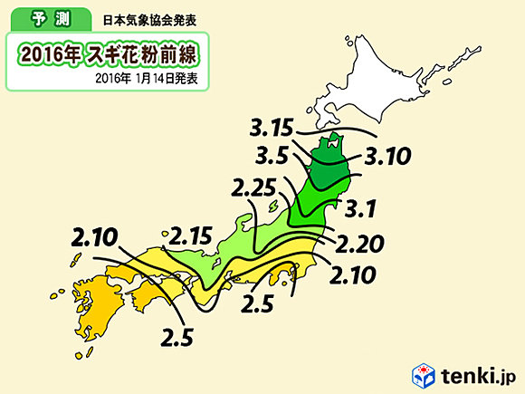 スギ花粉の飛散は2月上旬から開始されているようで2016年スギ花粉前線によると、2月上旬には九州・中国・四国・東海・関東地方から、スギ花粉の飛散が始まる見込みとなっていた。その後、花粉前線は2月中旬には関東地方を通り、3月中旬にかけて東北地方を北上する予測となっているが横浜住まいの私はすでに3日から徴候が出ている。マスク必携で出かけなくては。