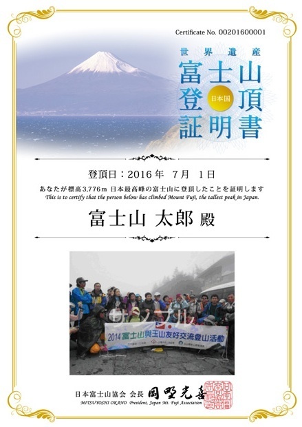 山梨県側では7月1日に、静岡県側では10日に開山する富士山の両県の自治体などでつくる日本富士山協会は富士山登頂者に「富士山登頂証明書」を発行している。対象は7月から9月の登頂者で、協会のウェブサイトから申し込むと名前や登頂日を印刷した証明書が送られてくるそうです。