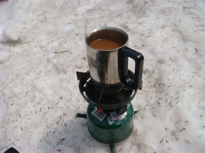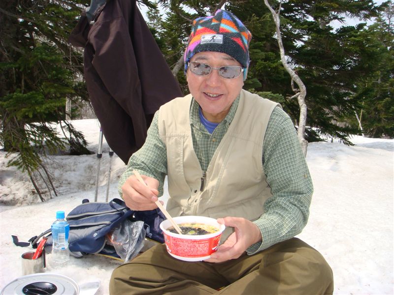 暖かな日差しの中でお湯を沸かし、カップラーメンで昼食。春スキーはこれだからやめられない。自然の中でのBCスキーならではの醍醐味である。