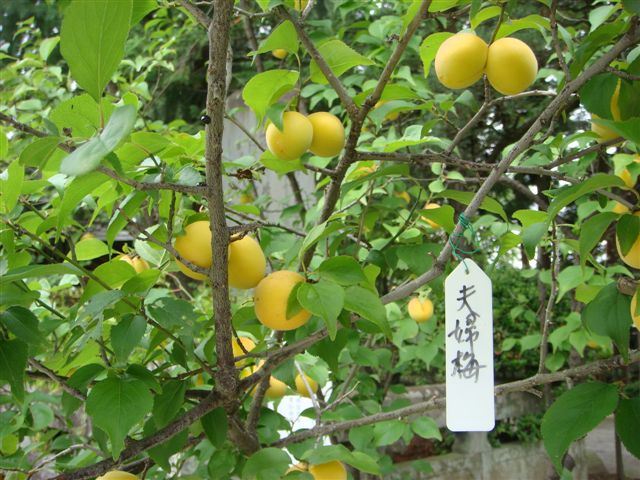 写真を見てもらえば判るのだが2つの梅の実がくっついているのだ。夫婦仲良く子供も授かるとの伝えガある梅でおまいりの人も多いようだ。この時期にしか見られないのでとても感激した。(写真をクリックして拡大してみてください)これから我々夫婦も夫婦梅にあやかり寄り添って老後を楽しめることだろう。