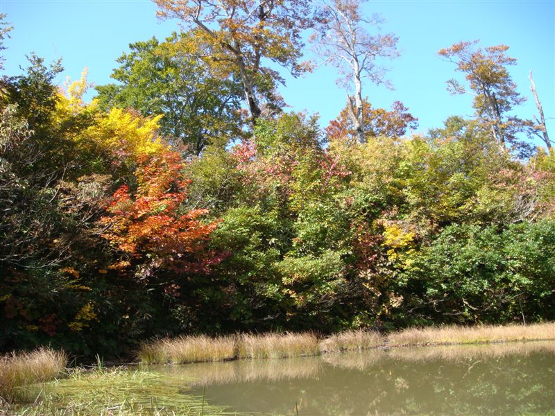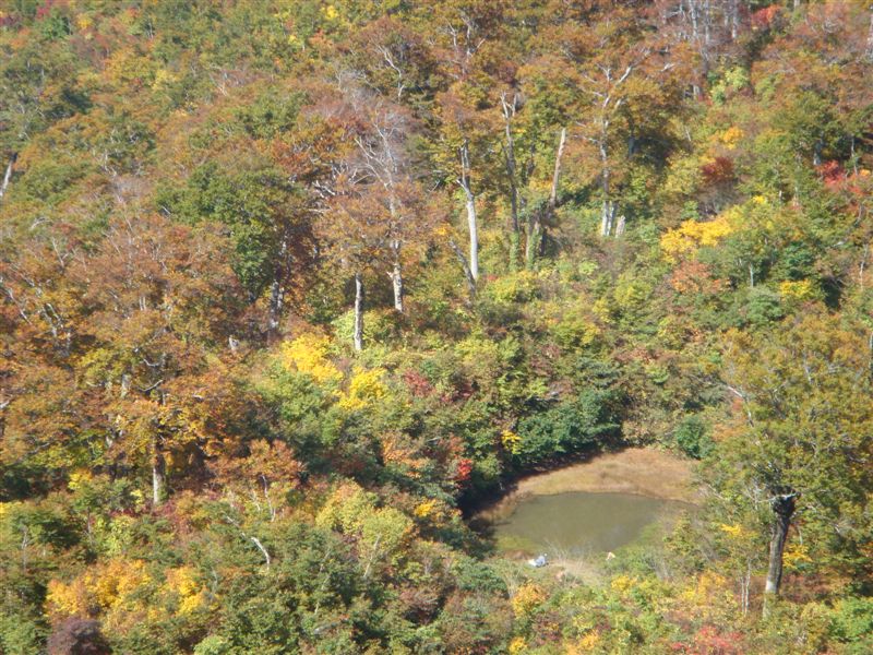 一気に4合目までロープウェイで上がり途中4合目半で会いにある漕池に寄り静かな池での紅葉を楽しんだ。この池はモリアオガエルの生息地だそうだ。