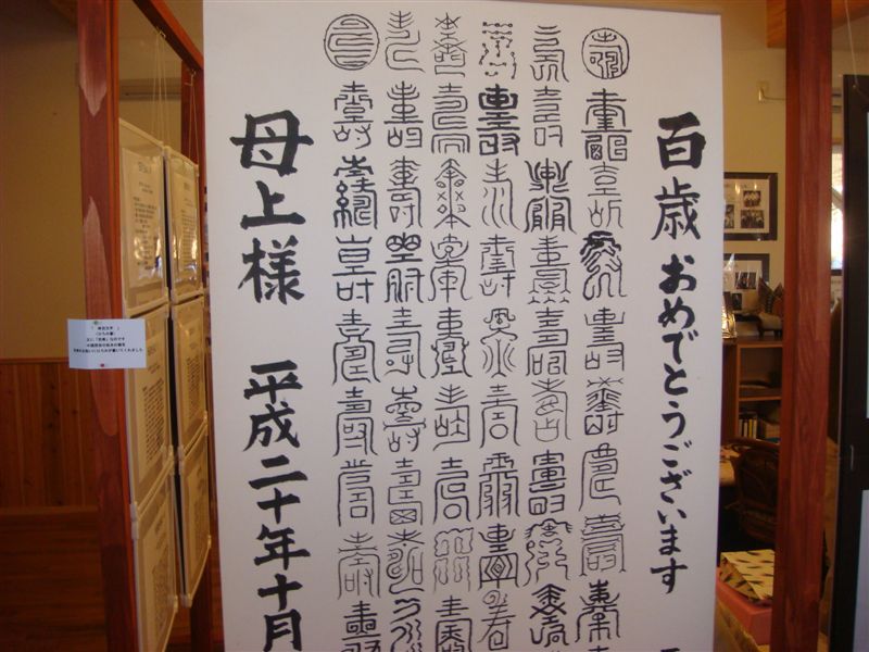 719ac705.jpeg昨日百歳万歳の日記を書いたがもう一枚写真があった。寿の文字である。書体の違う寿で埋め尽くされている書である。おばあちゃんの子供が書いたそうだ。寿、壽・・・・とみていてとても幸せになりこの書からも“気”を沢山頂いてきた。我が家も今年は寿で埋め尽くされることを願っている。