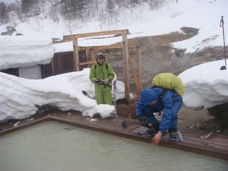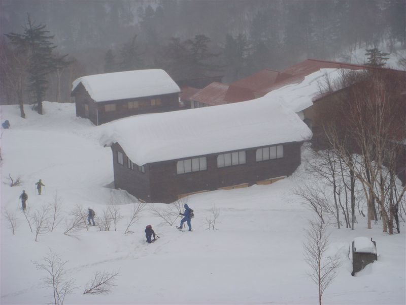 温泉を出て帰路につき、テレマーカー2人(私も)はゲレンデをスキーで下り、スノシュー組4人は山を迂回する道路で後生掛温泉へと戻りました。そしてゆったりと温泉につかり湯治と宴会第二夜が始まり夜はふけていくのでありました。