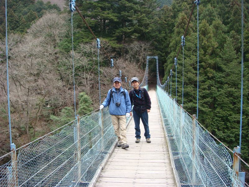 多くの巨岩が見え新緑か紅葉の時期が美しそうだ。つり橋は揺れて揺れてけっこうスリルがありますね。