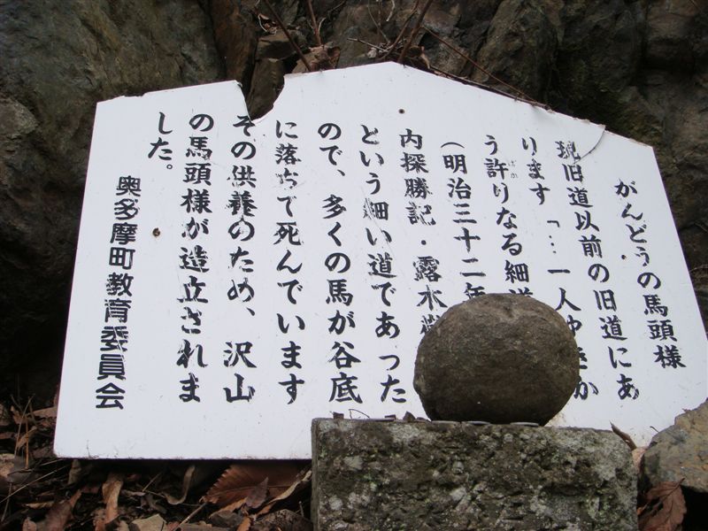 少し進むとがんどうの馬頭が崖に沿ったところにあります。多くの荷役の馬が谷に落ち命を落としその供養です。