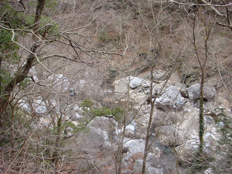 谷底をのぞくとしだらく渓谷の巨岩が良く見えます。明治40年の未曾有(みぞうゆうと読んではいけません)の大水で上流から流されて来た岩だそうです。
