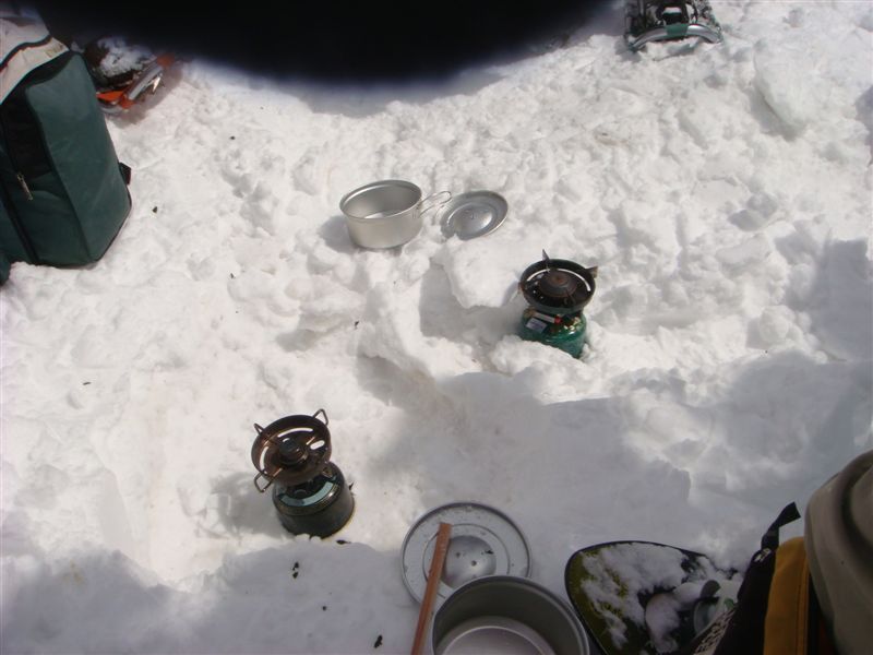 西吾妻も目の前に良く見えるが行くには時間的にきついのでここから下山することにした。山頂は風が強いので樹林帯に戻り昼食とした。写真は食べた後です。暖かいワンタンスープとおにぎりを食べました。