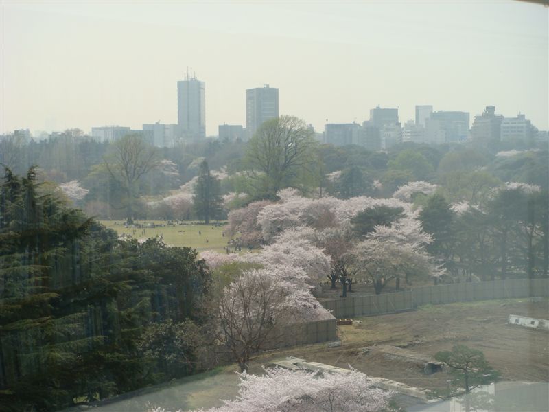 春霞がかかっているが満開の桜が見渡せる。ガラス窓越しなので写真写りは良くないが花見の穴場である。9階には喫茶室もある。そろそろ散り始めた桜だが園内で花見をしている人たちも見えた。3日には園内で花見をしたがこのロケーションも静かでとてもいい場所である。