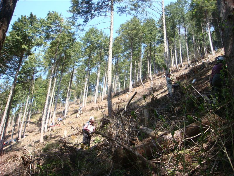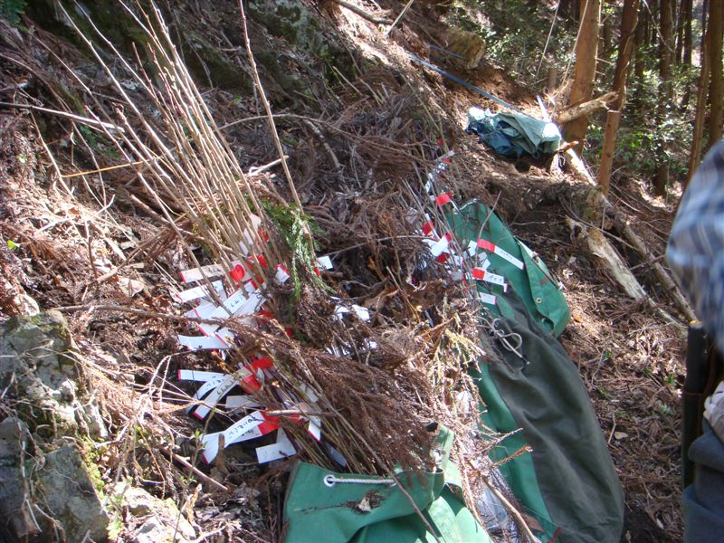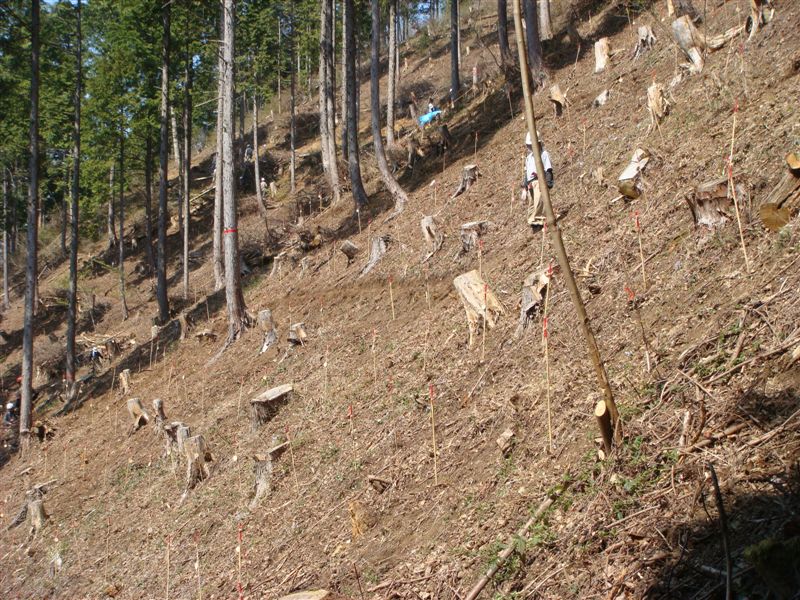 1時間くらい林道を登り今回の植栽地に到着です。とにかく足場の悪い急斜面である。